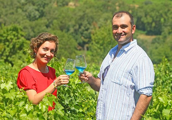 Los propietarios de Bodegas y Viñedos Amaya, pertenecientes a la D.O. Bierzo, Amaya Rodríguez y Florencio García, autores del vino azul Byva Blue, en uno de sus viñedosUn azul 'Bierzo'. Así puede empezar a denominarse la nueva tipología de vinos hechos por la bodega Amaya, con las variedades Doña Blanca y Palomino. Un frizzante que busca llamar la atención de nuevos mercados.