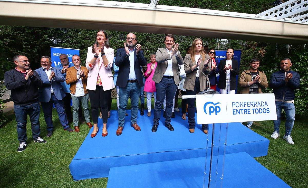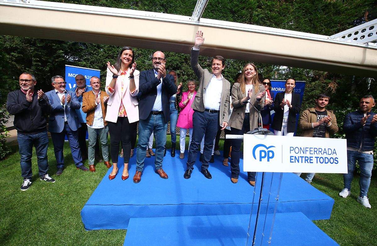 El presidente del Partido Popular de Castilla y León, Alfonso Fernández Mañueco, junto a la presidenta del PP de León, Ester Muñoz, y el candidato a la Alcaldía, Marco Morala, durante el mitin celebrado está mañana en PonferradaPor su parte, el candidato a la alcaldía, Marco Morala, reiteró que su programa “se resume en tres palabras: empleo, empleo y empleo”. “Te toca ayudarnos a llenar los polígonos industriales de empresas”, reclamó el candidato al presidente autonómico del partido. “Las empresas no son nuestros enemigos, son los que generan empleo”, insistió Morala, que avanzó su intención de aprobar una reforma tributaria para rebajar la presión fiscal a familias y empresas.