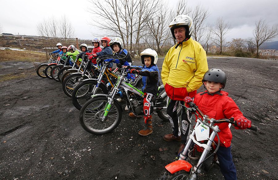 Sebas Prieto (2D), junto a varios de sus alumnos de su escuela de trial 'Sebastrial', que forma parte del negocio familiar del que se cumplen cien años