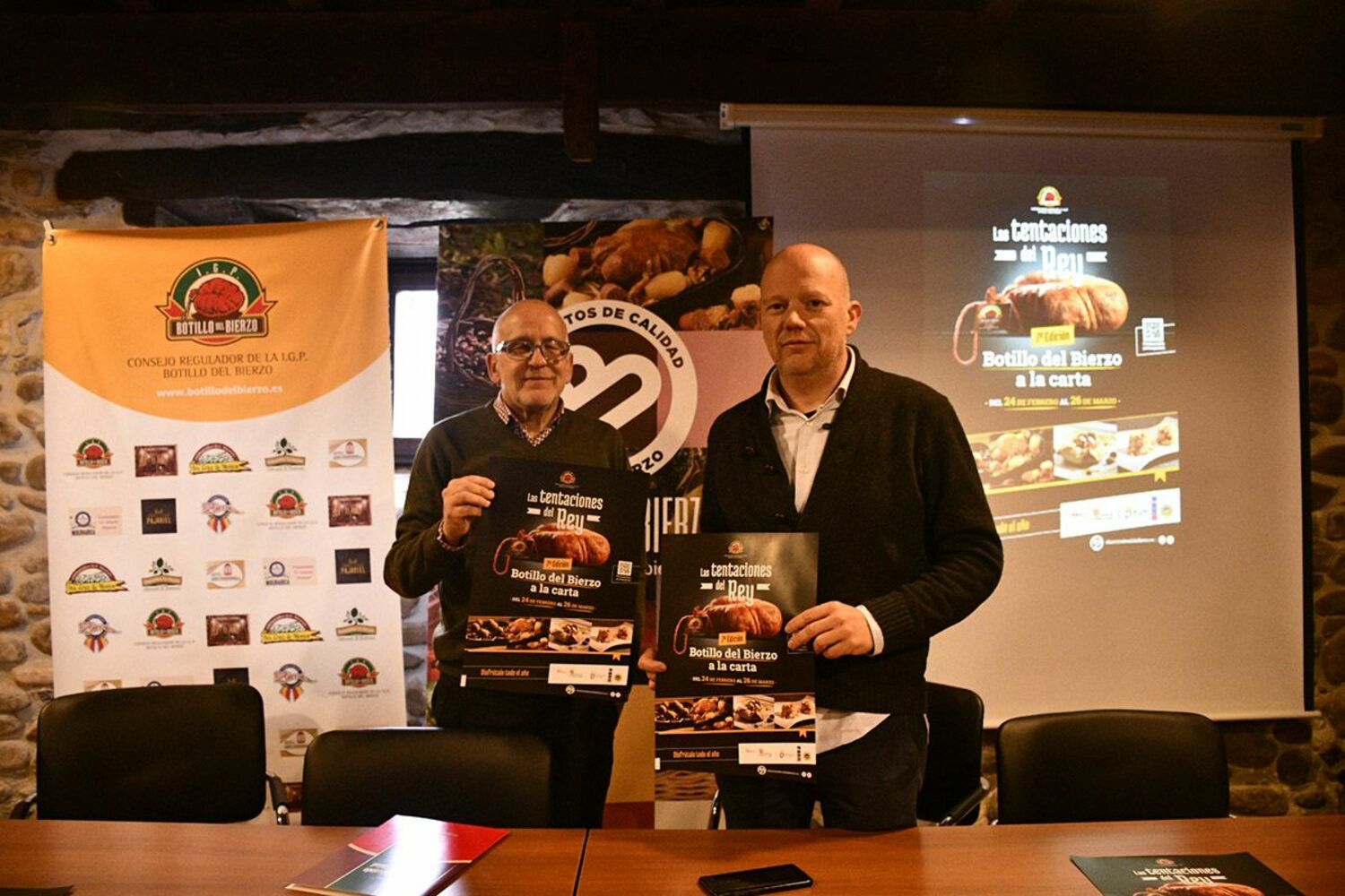 Foto: El presidente del Consejo Regulador de la IGP Botillo del Bierzo, Óscar Ramos (I), junto al director técnico, Pablo Linares (D), durante la presentación de la séptima edición de las jornadas ‘Las tentaciones del rey’ / Foto: Dani Merino / InfoBierzo"Una vez que nos comuniquen desde patentes y marcas, que se nos comunicará, porque el Consejo Regulador es propietario de la palabra 'Botillo' y 'Botillo del Bierzo', lógicamente relacionado con el Botillo como alimento, pues el Consejo Regulador tomará la decisión pertinente con respecto a ello", explica Óscar Ramos, presidente del Consejo Regulador de la lGP Botillo del Bierzo, añadiendo que "todo lo relacionado con el Botillo en alimentación, la propiedad es del Consejo Regulador".
