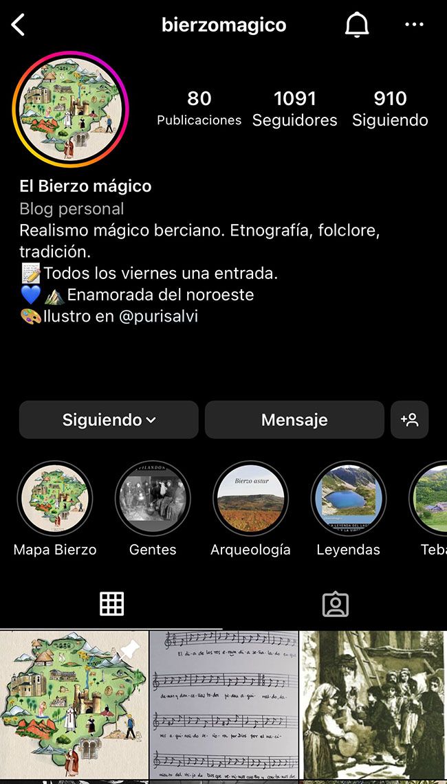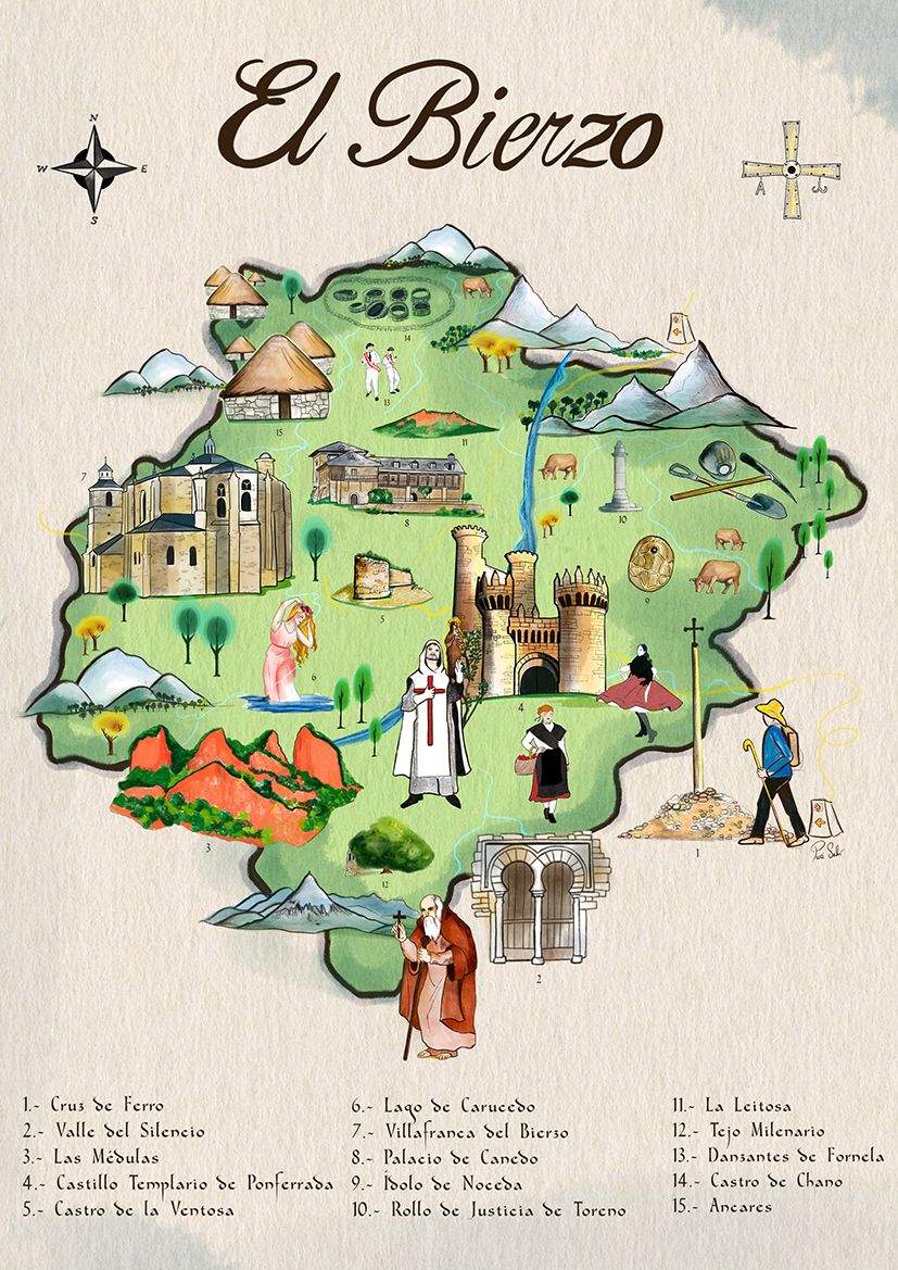 Foto: Cuenta de Instagram @bierzomagico en la que Puri Salví habla sobre etnografía, folclore y tradición.En este mapa ilustrado podemos disfrutar de un paseo por la Cruz del Ferro, el Valle del Silencio, Las Médulas, el Castillo Templario de Ponferrada, Castro de la Ventosa, el Lago de Carucedo, Villafranca del Bierzo, el Palacio de Canedo, el Ídolo de Noceda, Rollo de Justicia de Toreno, la Leitosa, el Tejo Milenario, dansates de Fornela, Castro de Chano, los Ancares y el Monasterio de Carracedo. Aunque la propia autora afirma que "no está todo, pues bien sabemos que lo mejor se esconde en los rincones de la tierrina", si es un punto de partida que deja patente su amor y cariño hacia la Comarca.