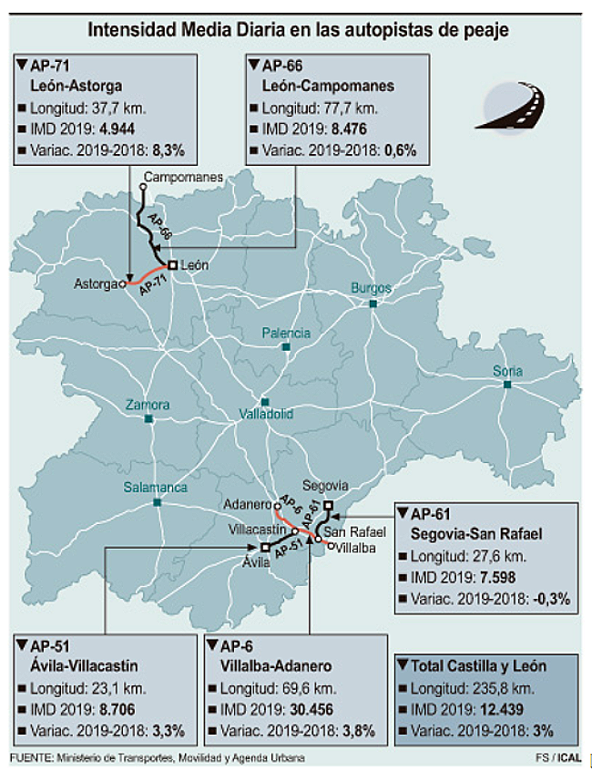 Las autopistas en Castilla y León, que conectan básicamente la Comunidad con Madrid y Asturias, además de dos importantes núcleos de población en la provincia leonesa, suman ahora casi 236 kilómetros, por los que circulan 12.439 vehículos, de los que poco más que 1.400 son pesados, según los datos provisionales que acaba de recopilar el Ministerio de Transportes, Movilidad y Agenda urbana.