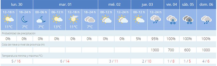 Partiendo de los 16º de máxima y 5º de mínima de este lunes, un grado menos en ambos sentidos para el martes, mientras que el miércoles las máximas no superarán los 11 grados y las mínimas caerán hasta los 3ºC. El jueves los mercurios lucharán por superar los 9º de máxima y las mínimas rozarán el grado negativo todo el fin de semana. En cuanto a las máximas, serán de ocho grados el viernes, cinco el sábado y seis el domingo.