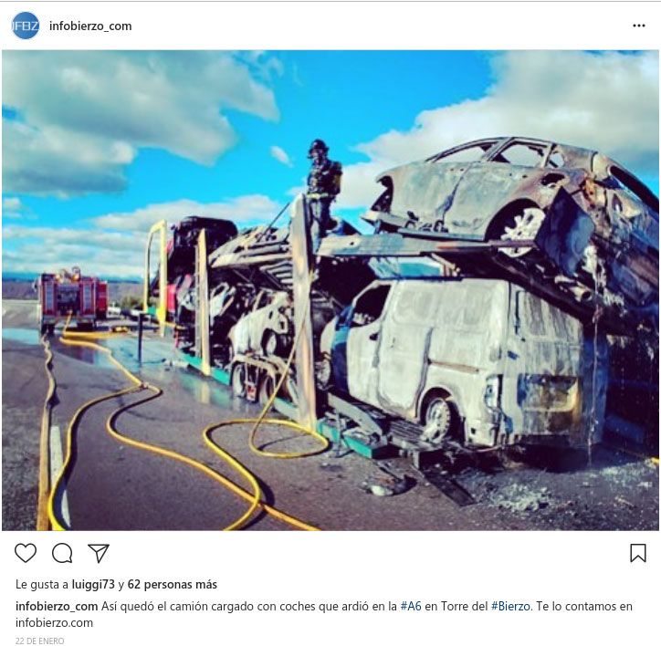Arde un camión cargado de coches en la A-6 a su paso por Torre del Bierzo