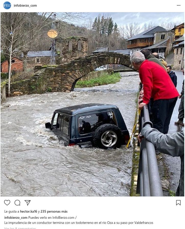 La imprudencia de un conductor termina con un todoterreno en el río Oza a su paso por Valdefrancos