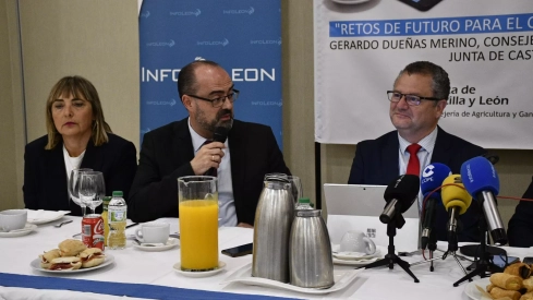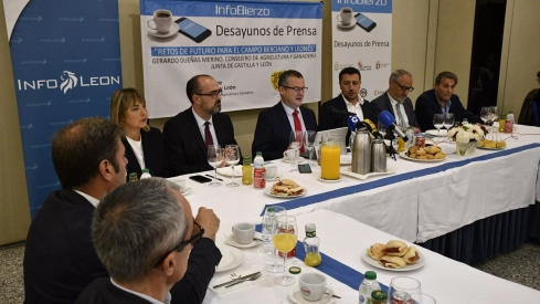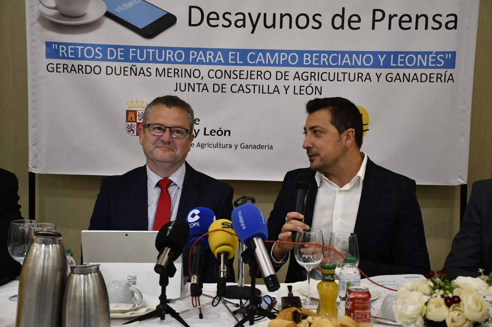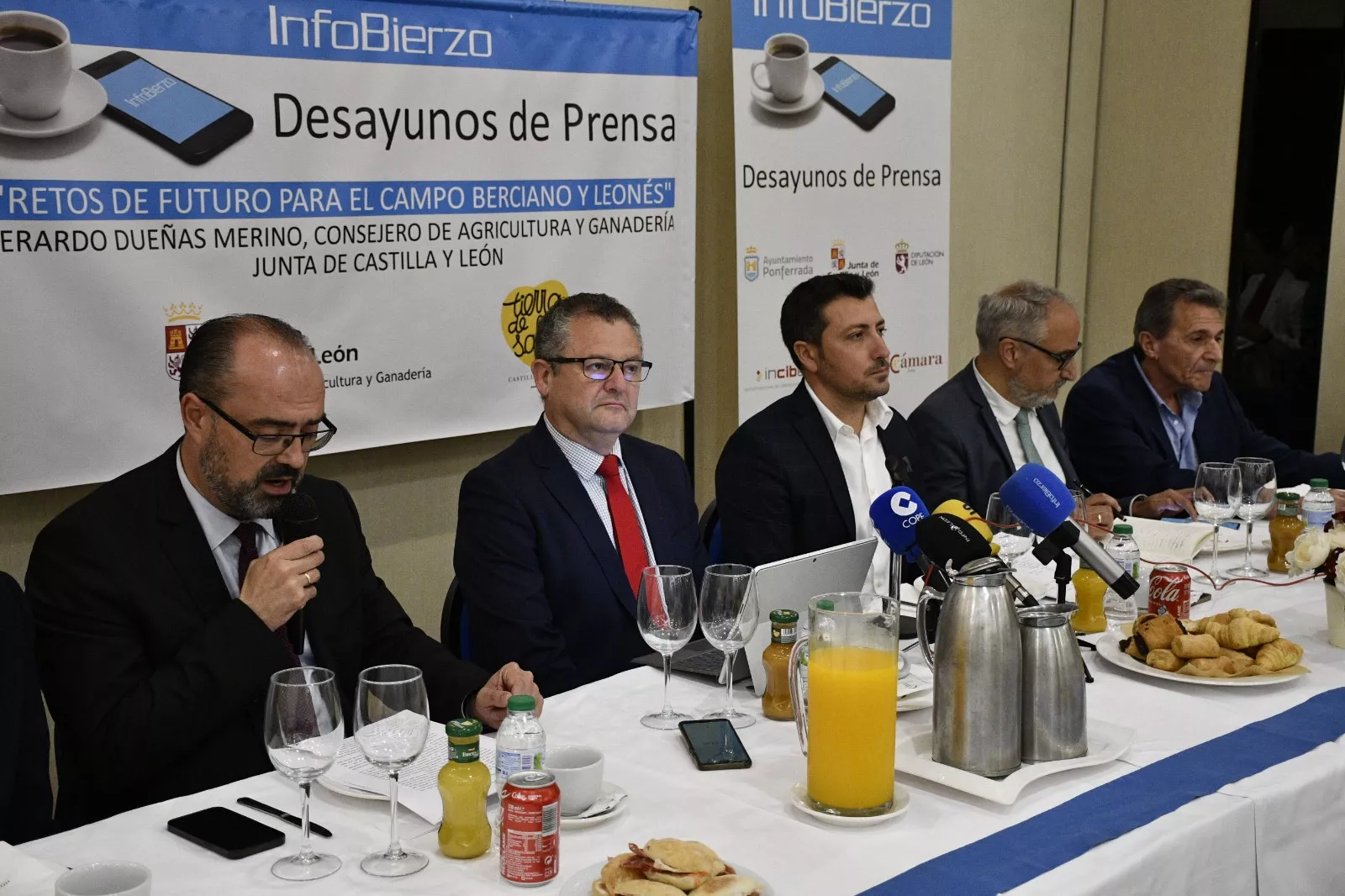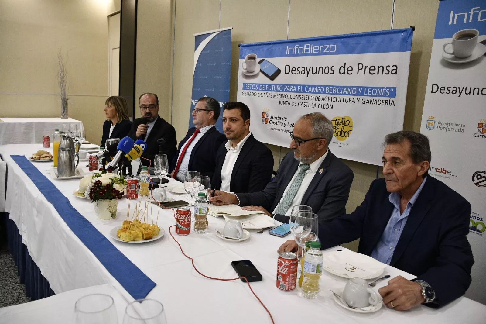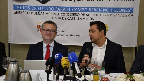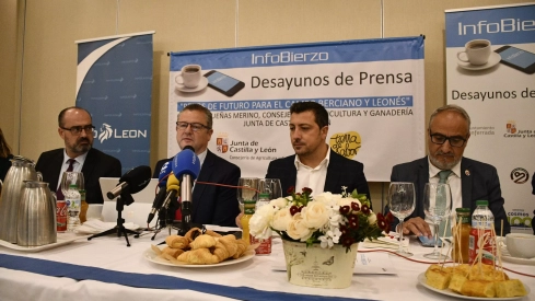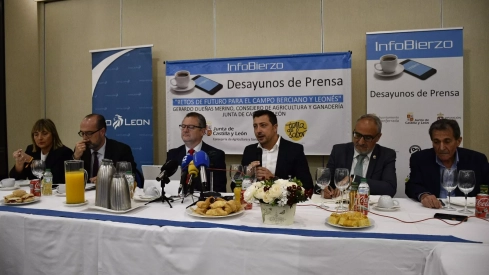 El consejero de Agricultura y Ganadería, Gerardo Dueñas, incidió en el gran trabajo que hacen los productores por conseguir la máxima calidad, especialmente en el León y El Bierzo, donde se encuentran el 30% de las 22 figuras de calidad de Castilla y León. “Las condiciones del Bierzo ofrecen una gran capacidad para la producción. Las ventas de los siete sellos superaron en 2023 los 61 millones de euros en cuota de mercado anualmente. Ahora estamos trabajando en una fase de estudio para la consecución de tres figuras nuevas, dos de ellas en el Bierzo, que son la miel y la IGP de la pera, y otra a nivel provincial que es el chorizo”, añadió en el desayuno de prensa en Ponferrada, organizado por InfoBierzo e InfoLeón, donde repasó la situación de la agricultura y la ganadería en la región leonesa.