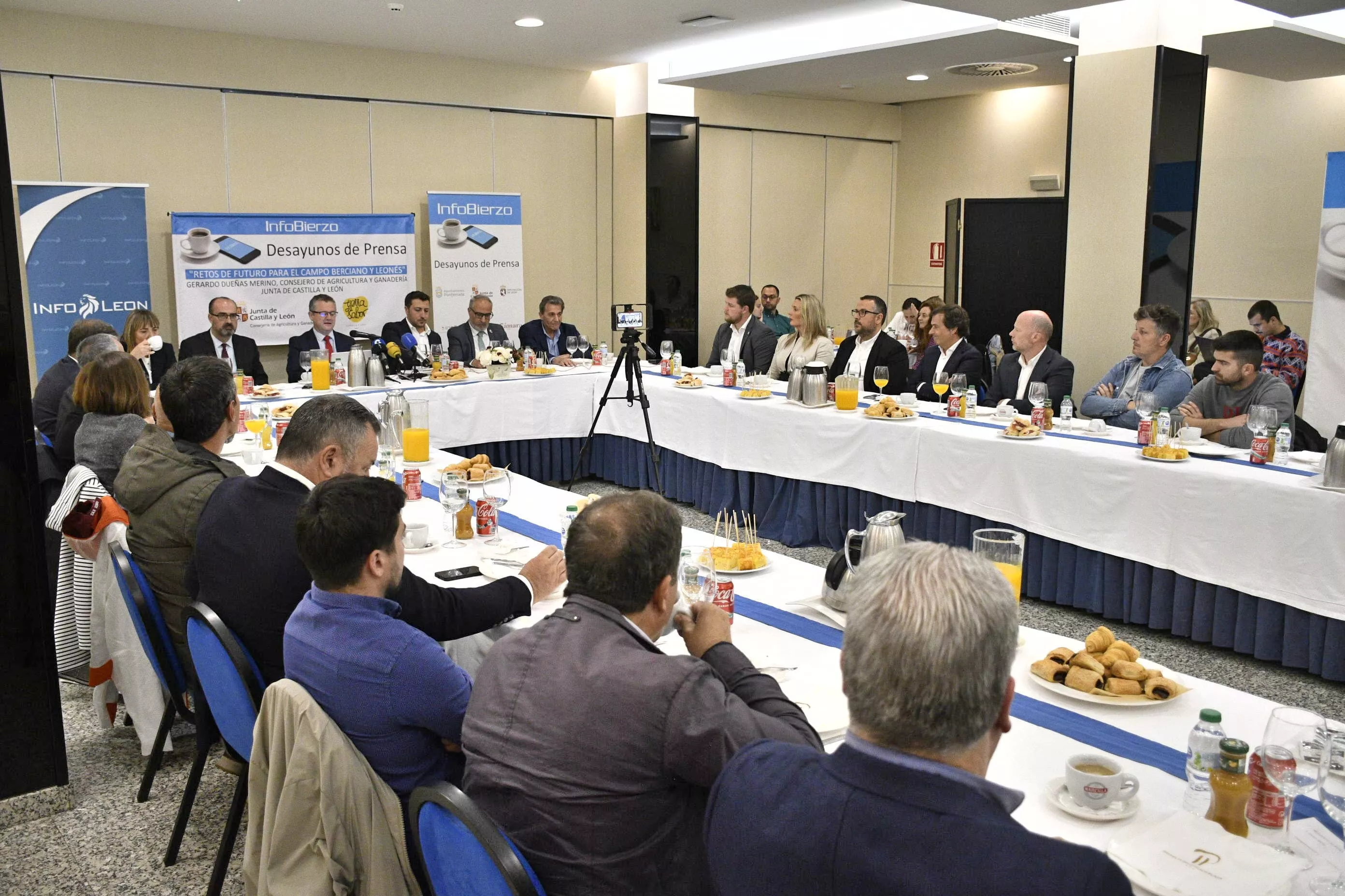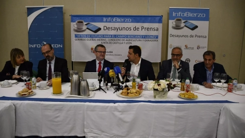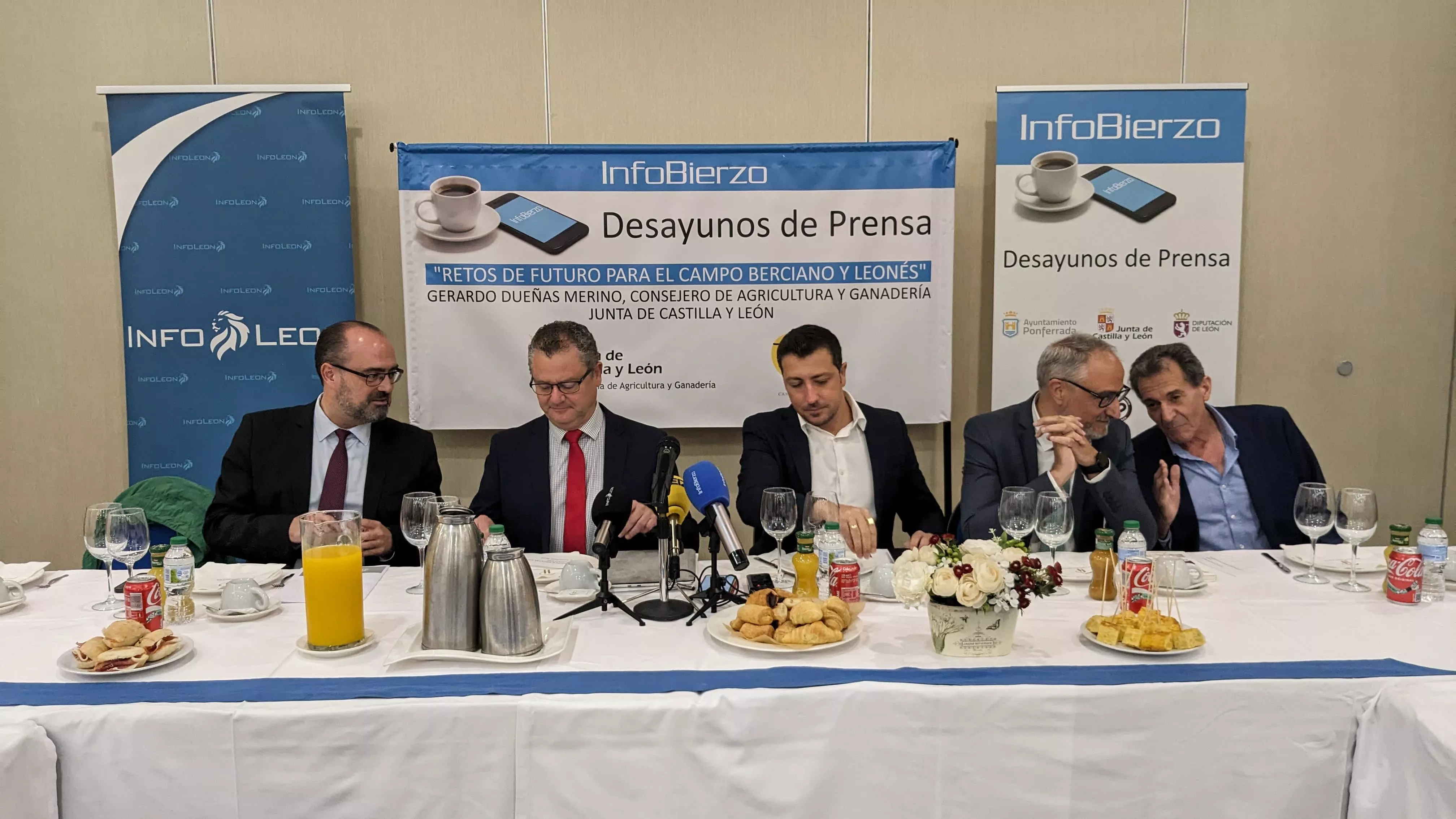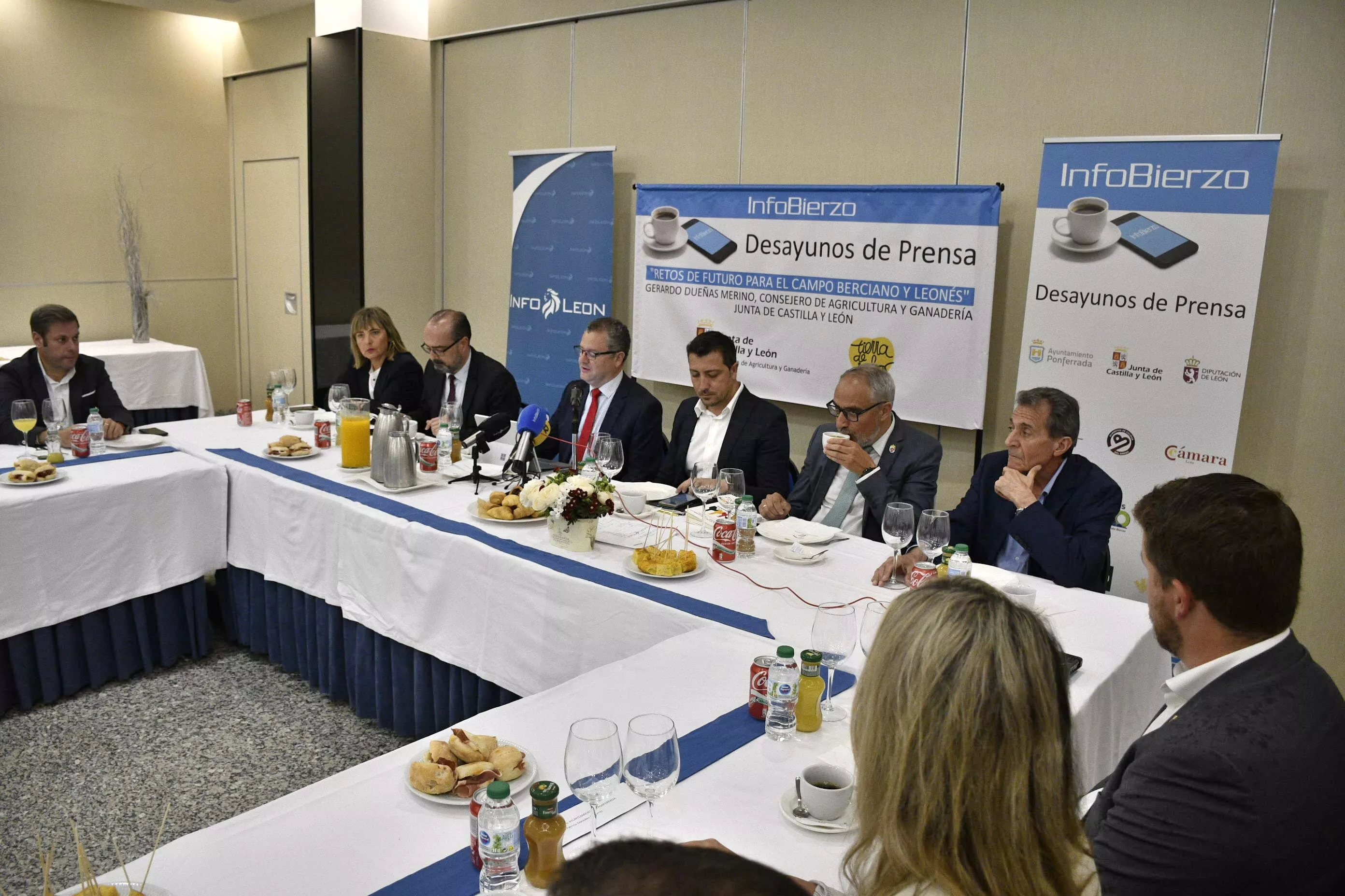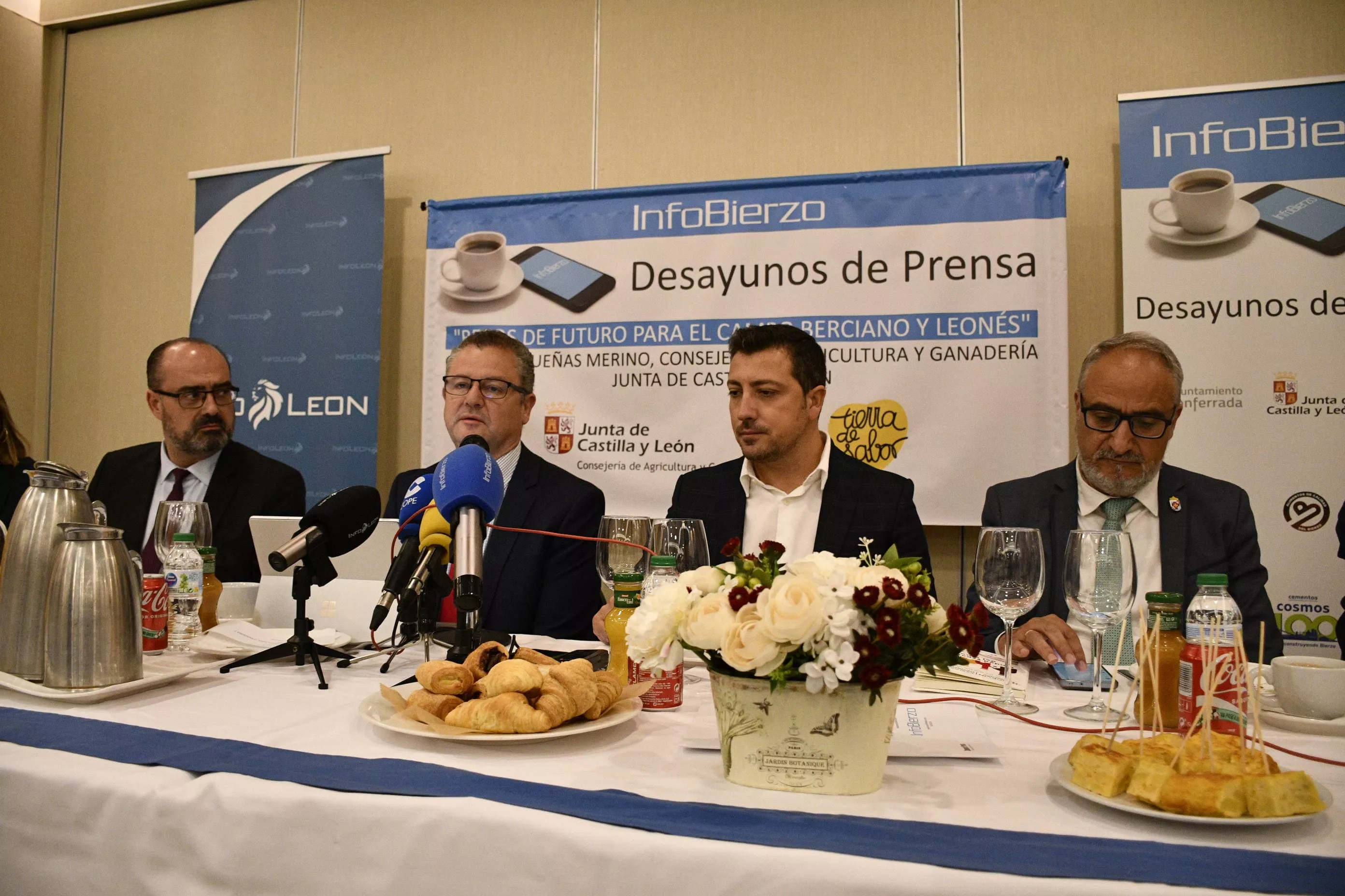 El consejero de Agricultura y Ganadería, Gerardo Dueñas, incidió en el gran trabajo que hacen los productores por conseguir la máxima calidad, especialmente en el León y El Bierzo, donde se encuentran el 30% de las 22 figuras de calidad de Castilla y León. “Las condiciones del Bierzo ofrecen una gran capacidad para la producción. Las ventas de los siete sellos superaron en 2023 los 61 millones de euros en cuota de mercado anualmente. Ahora estamos trabajando en una fase de estudio para la consecución de tres figuras nuevas, dos de ellas en el Bierzo, que son la miel y la IGP de la pera, y otra a nivel provincial que es el chorizo”, añadió en el desayuno de prensa en Ponferrada, organizado por InfoBierzo e InfoLeón, donde repasó la situación de la agricultura y la ganadería en la región leonesa.