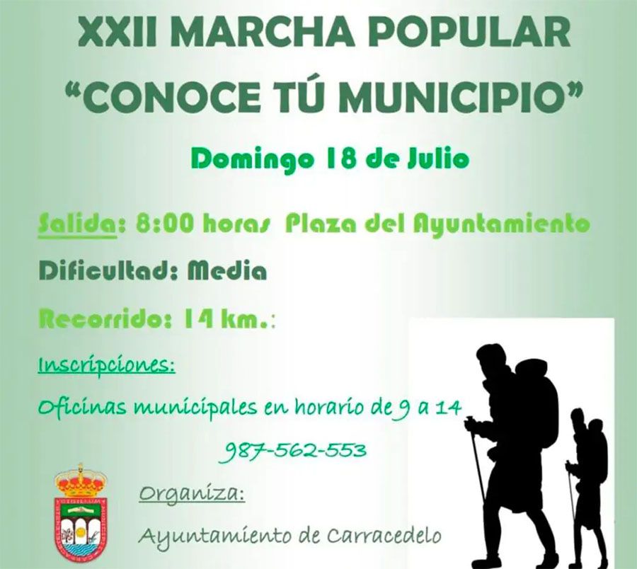 El próximo domingo 18 de julio se celebrará en Carracedelo la XXII Marcha Popular “Conoce tu municipio”. La salida será a las 8.00h desde la Plaza del Ayuntamiento de la localidad. La marcha está calificada con una dificultad media y el recorrido serán 14 kilómetros a lo largo del municipio.