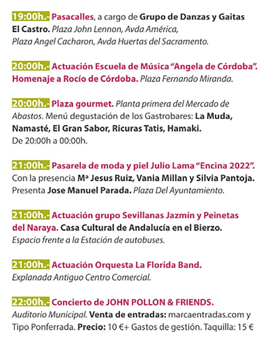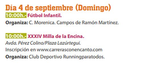 - 10h. a 13 h- La XXXIV Milla de La Encina. Tiene como peculiaridad este año que se celebrará el domingo día 4, "para que pueda asistir el mayor número de gente posible". Desde las 10 de la mañana podrán asistir todo el que quiera, "haciendo hincapié en los niños", en un recorrido de 800 metros en la Avenida Pérez Colino de Ponferrada. Habrá una carrera competitiva en la que correrán "atletas de alto nivel de la zona" y una popular. La carrera competitiva consistirá en 2.609 metros, lo que supone 2 vueltas "y un poco más", según matiza la organización