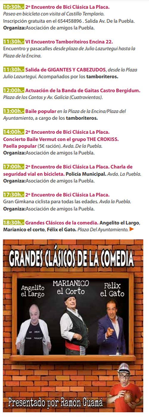 - 14h.- Encuentro de bicicleta clásica . En la avenida de La Puebla, con fiesta y paella popular.