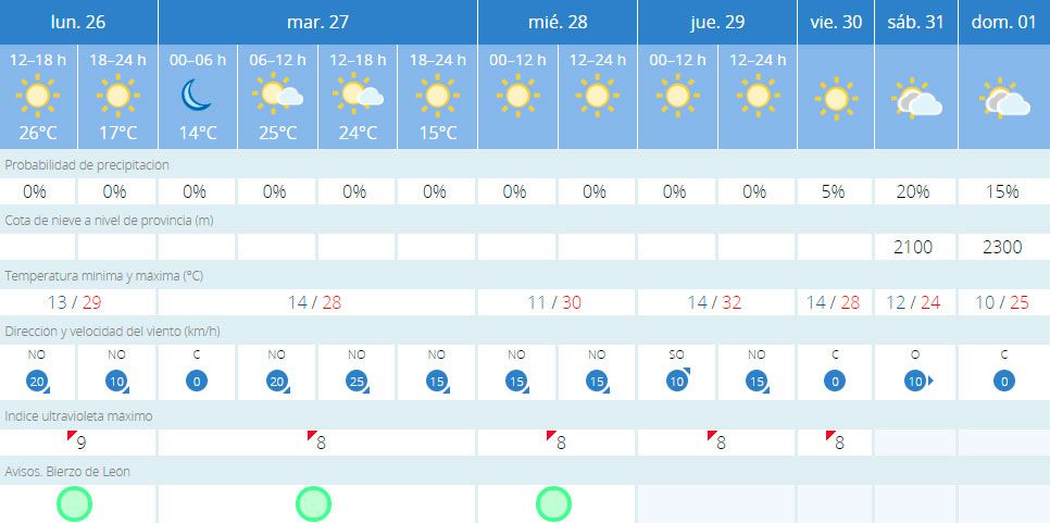 Ponferrada se despierta este lunes con unas temperaturas ligeramente más bajas que la semana pasada, con una máxima de 30ºC y una media de 28ºC. Los cielos permanecerán despejados durante toda la semana, excepto, quizá el fin de semana, donde se podrán ver algunas nubes. Las máximas irán subiendo progresivamente hasta el jueves. A partir del viernes las temperaturas descenderán un par de grados, hasta los 25ºC.