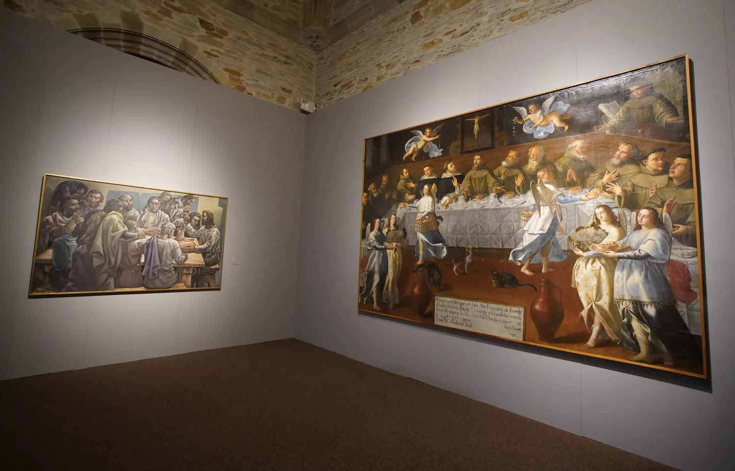 La visita continua en la Colegiata, que alberga 110 piezas llegadas desde diferentes puntos, como la Diócesis de Astorga, la Archidiócesis de Burgos, la de Valladolid, la Diócesis de León, Zamora u Orense, que cede a Villafranca para esta ocasión una importante pieza de alabastro chino-filipino que se guarda en la localidad de Celanova. También se puede ver ‘La visión de San Francisco’ de El Greco, que llega desde la Diócesis de Cádiz o estatuas del prestigioso escultor Luis Salvador Carmona. La muestra se estructura allí en cuatro estancias principales (vinculadas con la letra, la alegoría, el sentido moral y la anagogía), más el Preludio y los testimonios finales.