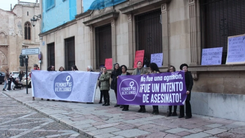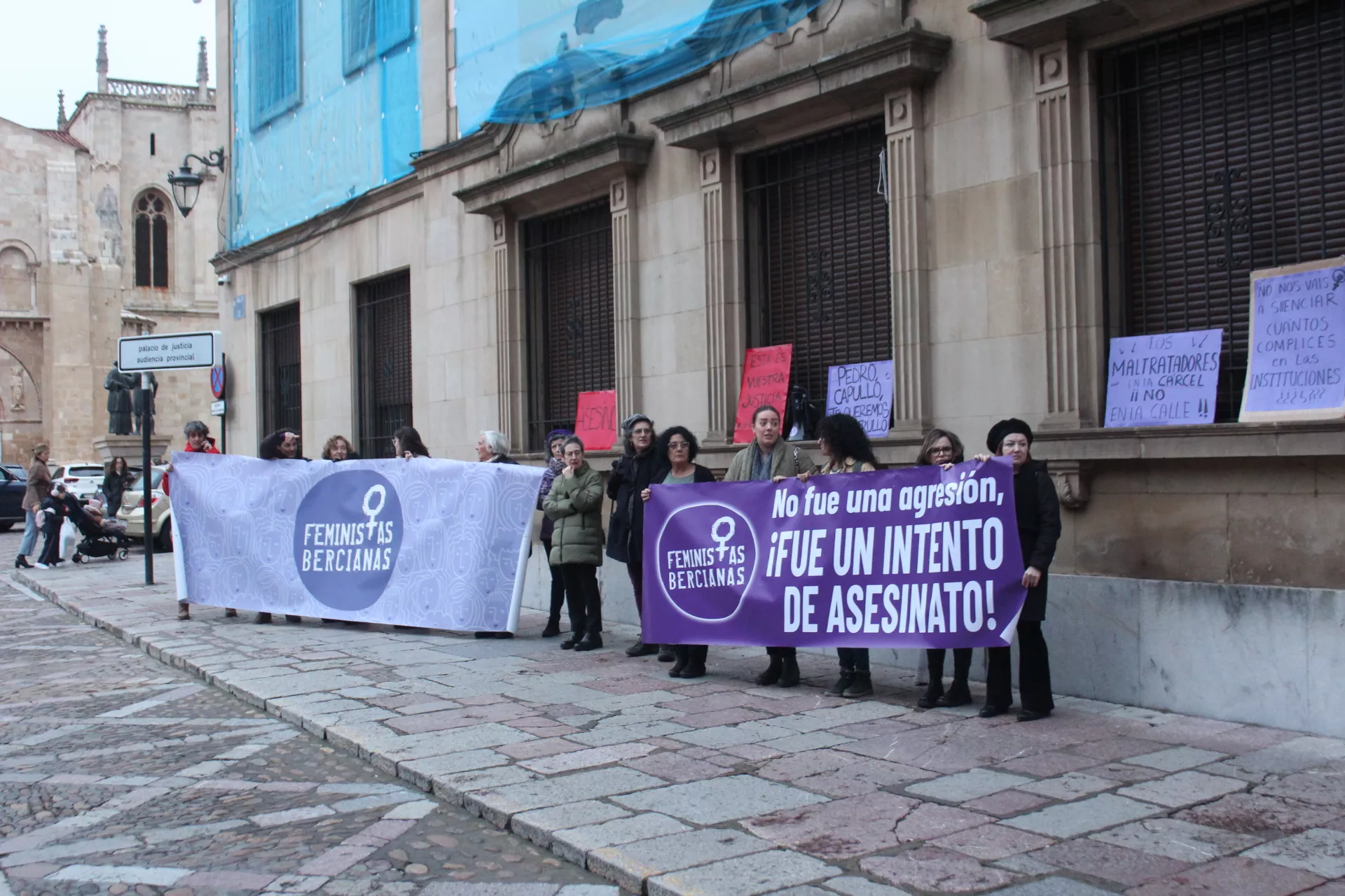 Pedro Muñoz ha llegado esta mañana a la cita a las 8:30 horas entre gritos de "Aquí están las amigas de Raquel" de la Asociación de Feministas Bercianas. “No fue una agresión, trató de asesinarla”, “Pedro, cabrón, púdrete en prisión”, “Pedro, capullo, te queremos en el trullo” o “No fue una agresión, no se arrepintió, asesinarla era su intención”, fueron algunos de los gritos coreados hoy por varias miembros Asociación de Feministas Bercianas, que se concentraron a las puertas de la Audiencia Provincial de León ante el inicio del juicio contra Pedro Muñoz por los presuntos delitos de tentativa de homicidio, maltrato, amenazas, injurias y lesiones contra la que fue su mujer. Allí, las mujeres advirtieron que “ahora mismo está sobre la mesa de forma palpable la posibilidad de que Muñoz salga impune de un intento de asesinato”, lo que “eleva la pesadilla a su versión más terrorífica”.