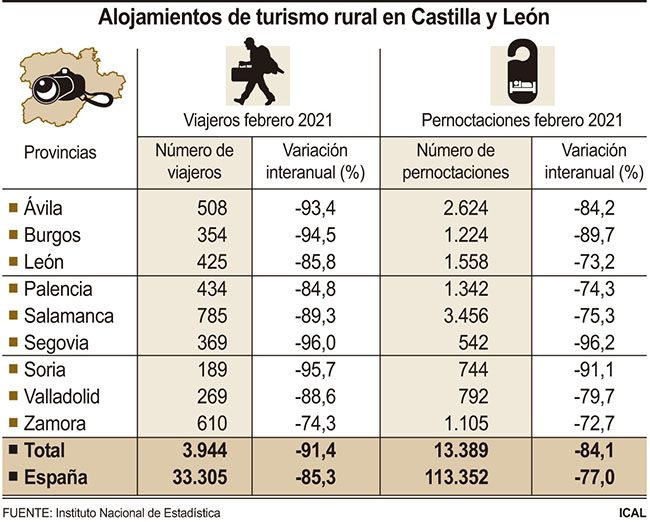 La caída de pernoctaciones en los alojamientos de turismo rural de Castilla y León fue así más marcada, un mes más, que la media del conjunto nacional, que se situó en el 77 por ciento menos al registrar 89.778 pernoctaciones, muy por debajo de las 487.464 de febrero de 2020. También cayó, en ambos casos, el número de viajeros: Castilla y León recibió 3.944 frente a los 48.191 de hace un año, lo que supone una bajada del 91,8 por ciento, mientras que en el conjunto de España la caída fue del 85,2 por ciento, al pasar de los 224.808 de febrero de 2020 a los 33.306 del mismo mes de este 2021.