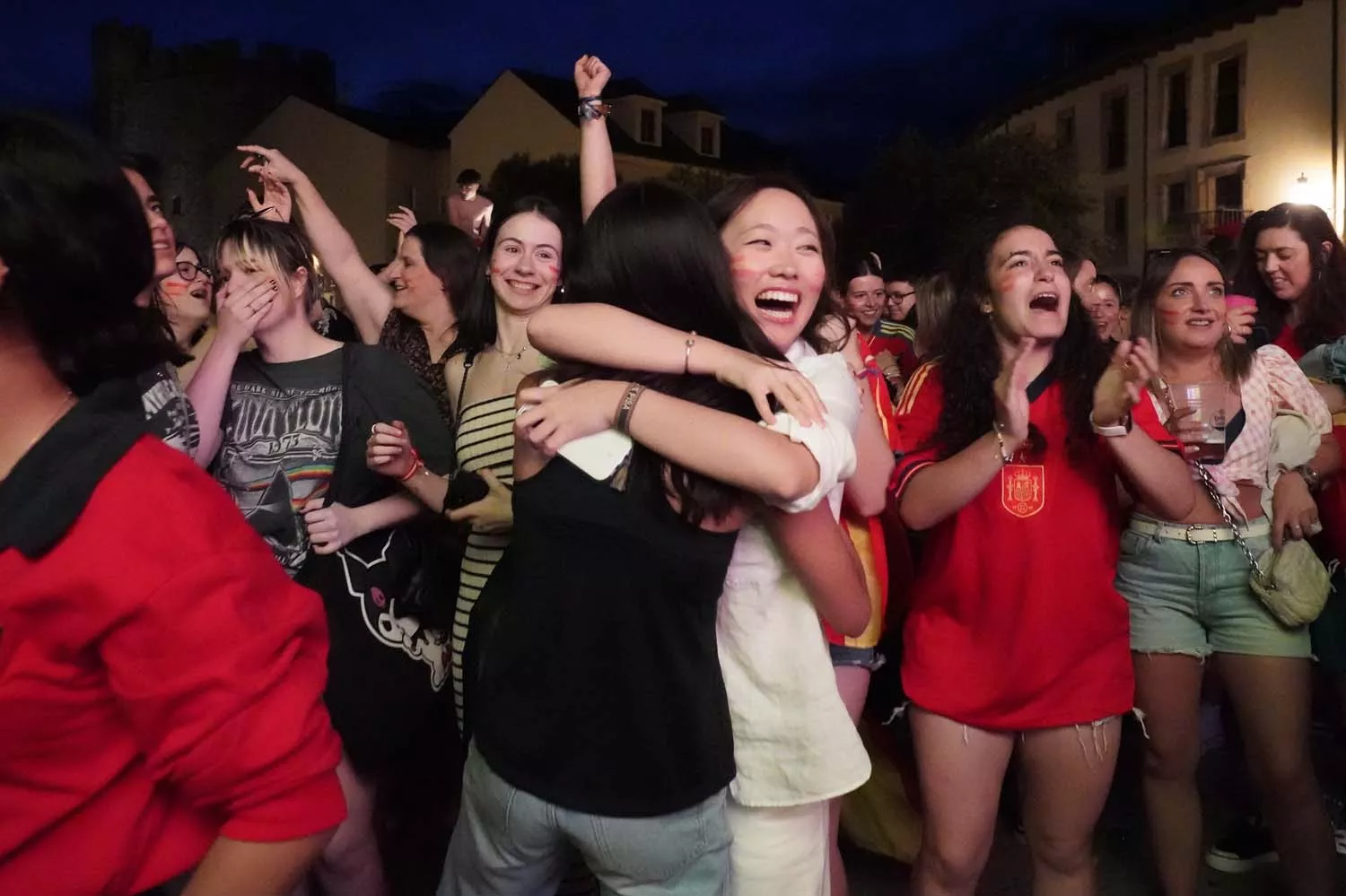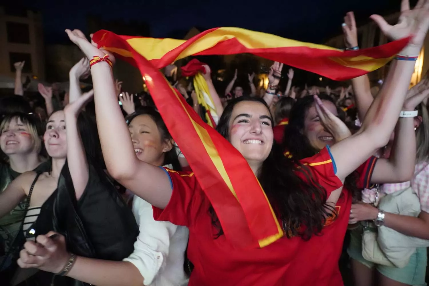 En cuestión de minutos, el centro de la capital berciana 'se tiñó' de rojo con banderas, camisetas y colores que celebran la cuarta Eurocopa de la Selección Española Masculina de Fútbol que ha sido posible gracias a los goles de Nico Williams en el minuto 47 y de Nico Williams en el 86 que hicieron 'explotar' el Casco Antiguo de la capital berciana.