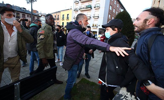 De este modo, ambos extremos políticos se 'vieron las caras' en la plaza de la Casa Consistorial, un 'choque' de pareceres que varias cuentas de redes sociales y medios conocidos a nivel nacional cubrieron . Así se pudieron ver 'propuestas' como la de Ricardo, un vecino de Ponferrada, que aunque vive en silla de ruedas, no dudó en imitar a Echenique, y bautizarse como "el Echenique de VOX". Aunque no se puede tampoco pasar por alto algún suceso que también trascurrió en la pasada tarde, como la confrontación de ideas, pero a gritos, sin mascarillas y sin distancia, cosa que también predominó durante todo el mitin, interrumpido también por gritos de '¡fascistas!' por otros grupos que asistieron a 'reventar' el acto de VOX.