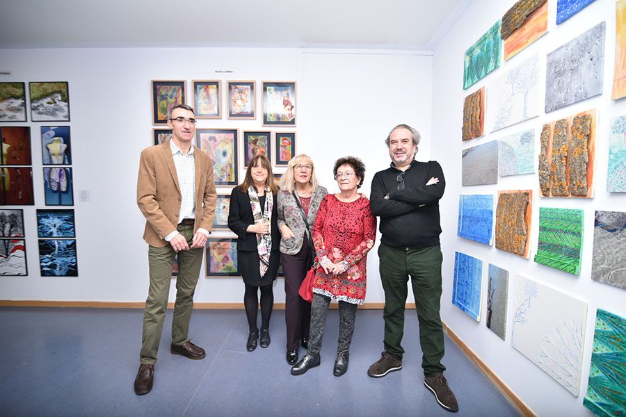 El vicerrector del Campus de Ponferrada, José Ramón Rodríguez (I), y el director del Área de Actividades Culturales de la ULE, César Ordóñez, junto a tres de las artistas que integran el colectivo 'Nosotras' durante la inauguración de la exposición