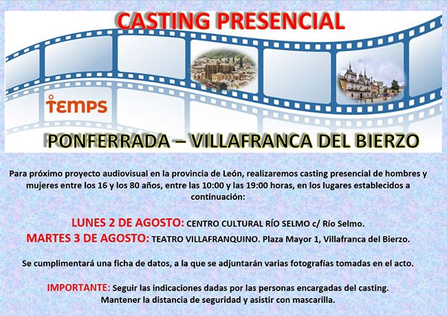 El casting en Ponferrada será el lunes 2 de agosto en el Centro Cultural Río Selmo, mientras que en Villafranca será el martes día 3 en el Teatro Villafranquino.