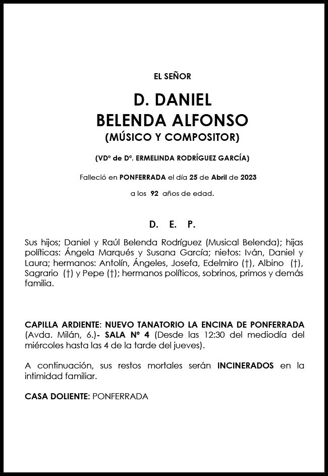 Concretamente Daniel Belenda podría definirse como un promotor, luchador y enamorado de la música del Bierzo, y más concretamente de Ponferrada. Un fallecimiento que tanto sus alumnos, como Jorge Prada, diversas agrupaciones de toda la Comarca, familiares y amigos, recordarán por siempre como un defensor del patrimonio inmaterial del Bierzo, siempre entre música. Además, su apellido responde a uno de los espacios de venta musical más relevantes de Ponferrada, como lo es 'Musical Belenda' gestionada por sus hijos.