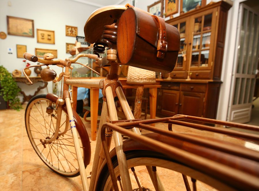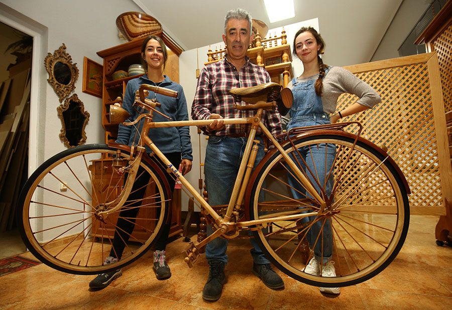 Reproducción en madera de la mítica bicicleta BH Gacela hecha por al artesanía Anmar de Cabañas Raras Reconocido con el título oficial de artesano de muebles y madera que expide la Junta, este maestro de la talla, la ebanistería y la taracea lleva más de 40 años dando forma con sus manos a maderas nobles y autóctonas, como el castaño, el nogal o el cerezo. “Lo que me gustan son los retos, ir un poco más allá, aprender siempre nuevas técnicas”, explica José, que valora contar con la colaboración de sus dos hijas, Andrea y Marta, en sus aventuras creativas.