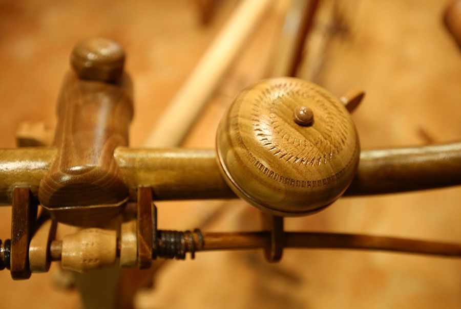 Esos impedimentos no fueron obstáculo para replicar todas las piezas de la bicicleta original en diferentes maderas de la zona, desde el manillar y los pedales a los eslabones de la cadena. Por supuesto son de este material el cuadro, el sillín o las llantas, pero el detallismo del artista también lo llevó a recrear en madera el timbre o el foco, con el correspondiente cable enroscado que lo une a la dinamo, una finísima pieza también hecha de madera.