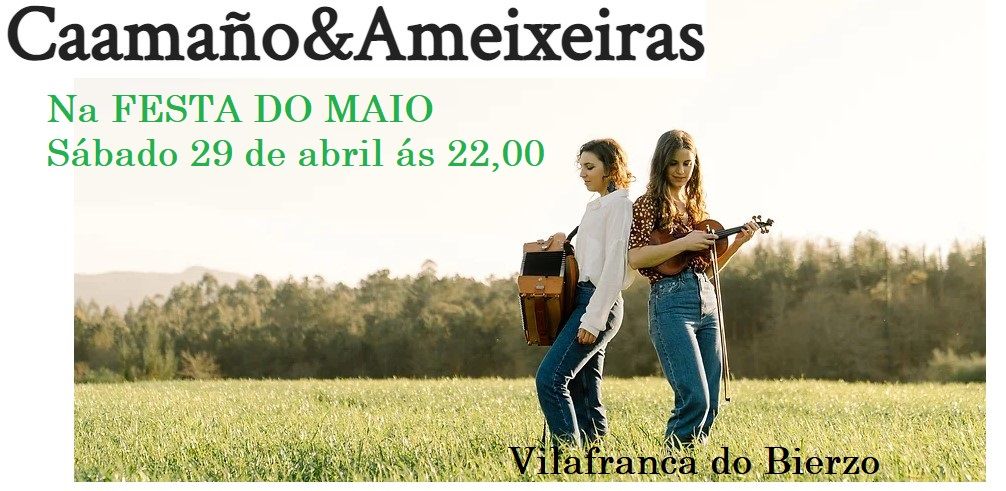 Es un lujo que Caamaño y Ameixeiras visitaran nuestra Fiesta de Mayo y aceptaran ser la banda sonora de esta primavera. Se trata de un grupo de reconocimiento internacional que ha revolucionado el panorama musical popular gallego en los últimos años. Sus integrantes Antía y Sabela son dos excelentes instrumentistas que transmiten la magia de la música de raíz con un vigor poderoso, una sencillez y una dulzura fuera de lo común que harán que su paso por Villafranca do Bierzo sea inolvidable para todos los presentes. Hemos programado este Concierto de Primavera con la colaboración del Ayuntamiento de Villafranca, que viene apostando cada año por potenciar esta fiesta tradicional, muestra viva de nuestra riqueza patrimonial.