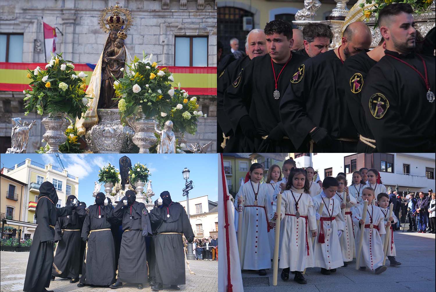 Así pudieron desfilar los pasos del Santísimo Sacramento y La Encina, hasta el encuentro pascual que se produjo en la plaza del Ayuntamiento, donde la Virgen de la Encina se quitó el luto al recibir la noticia de la resurrección. En ese momento tronaron las campanas en una de las últimas grandes citas de la Semana Santa ponferradina.
