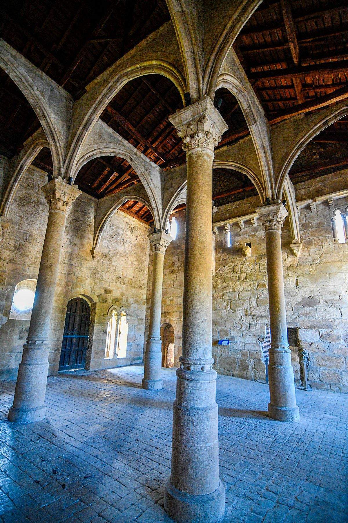 Era el comedor de los monjes. "Sus paredes perimetrales de silleria, excepto la entrada, corresponden a la fabrica medieval: ventanas abocinadas y tapiadas en su mayoria: púlpito abierto en su lado oeste -descubierto en la reciente restauración-, donde un monje leia mientras la comunidad comia en silencio, e indicios de su cubierta original, que seria en madera apoyada en arcos diafragma, de la que se pueden ver los modiliones tardorrománicos del alero del tejado en la planta alta. La puerta que comunica con la cocina era el antiguo torno por donde pesaban platos y cazuelas; el suelo de este paso corresponde con el nivel de circulación en época medieval", señalan los datos explicativos del Monasterio.