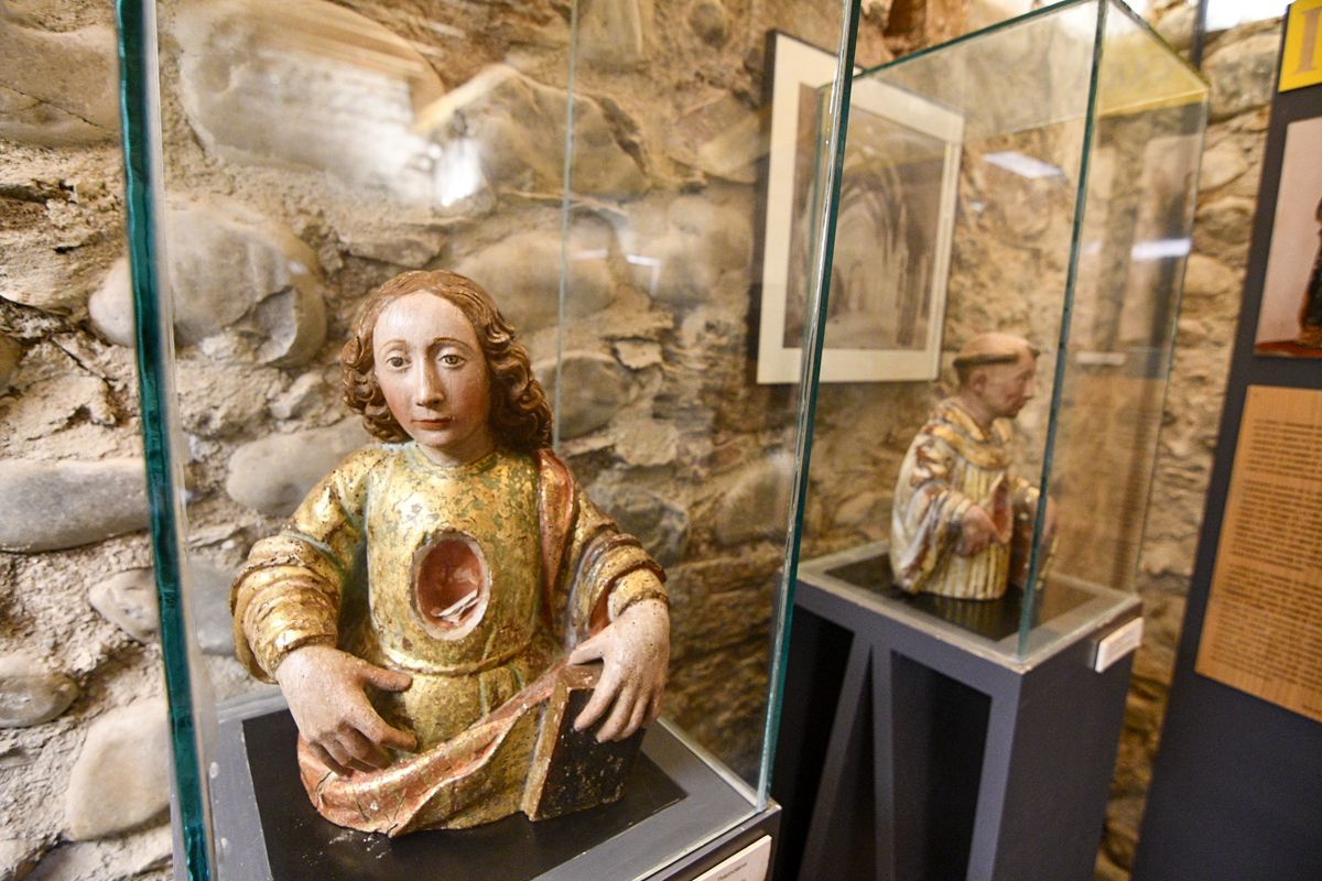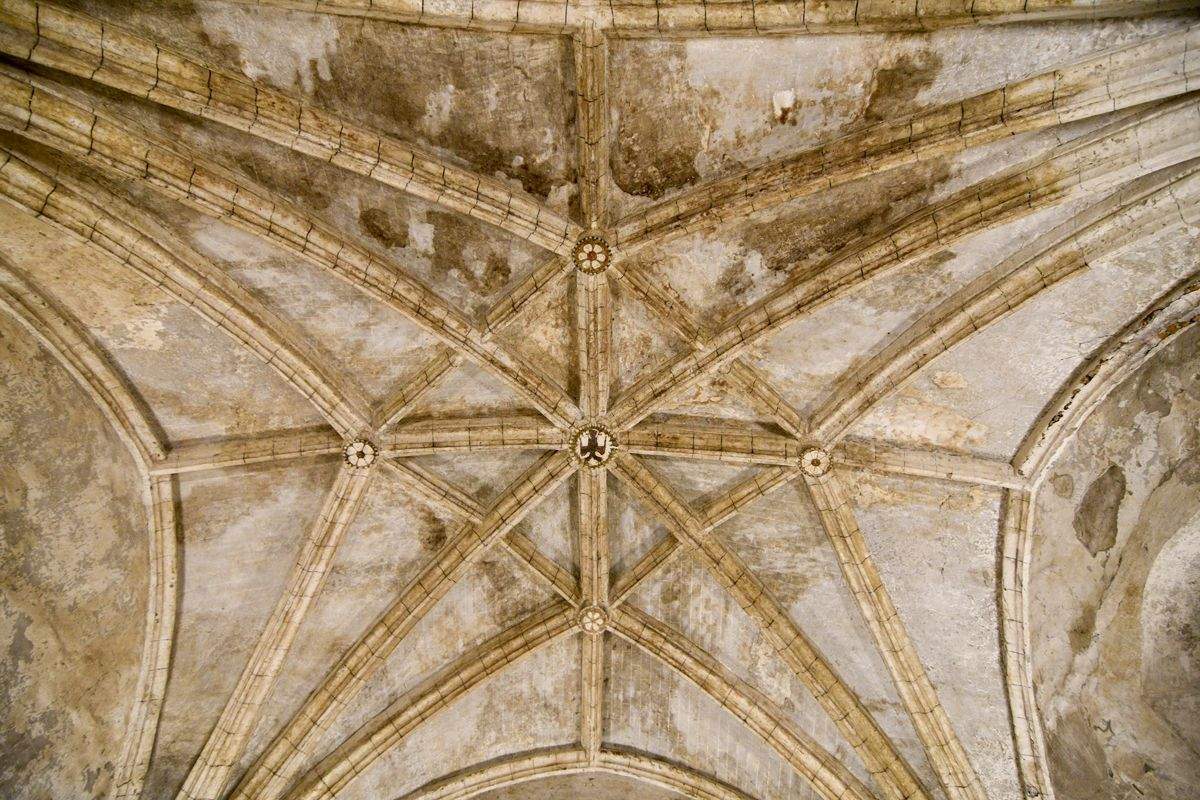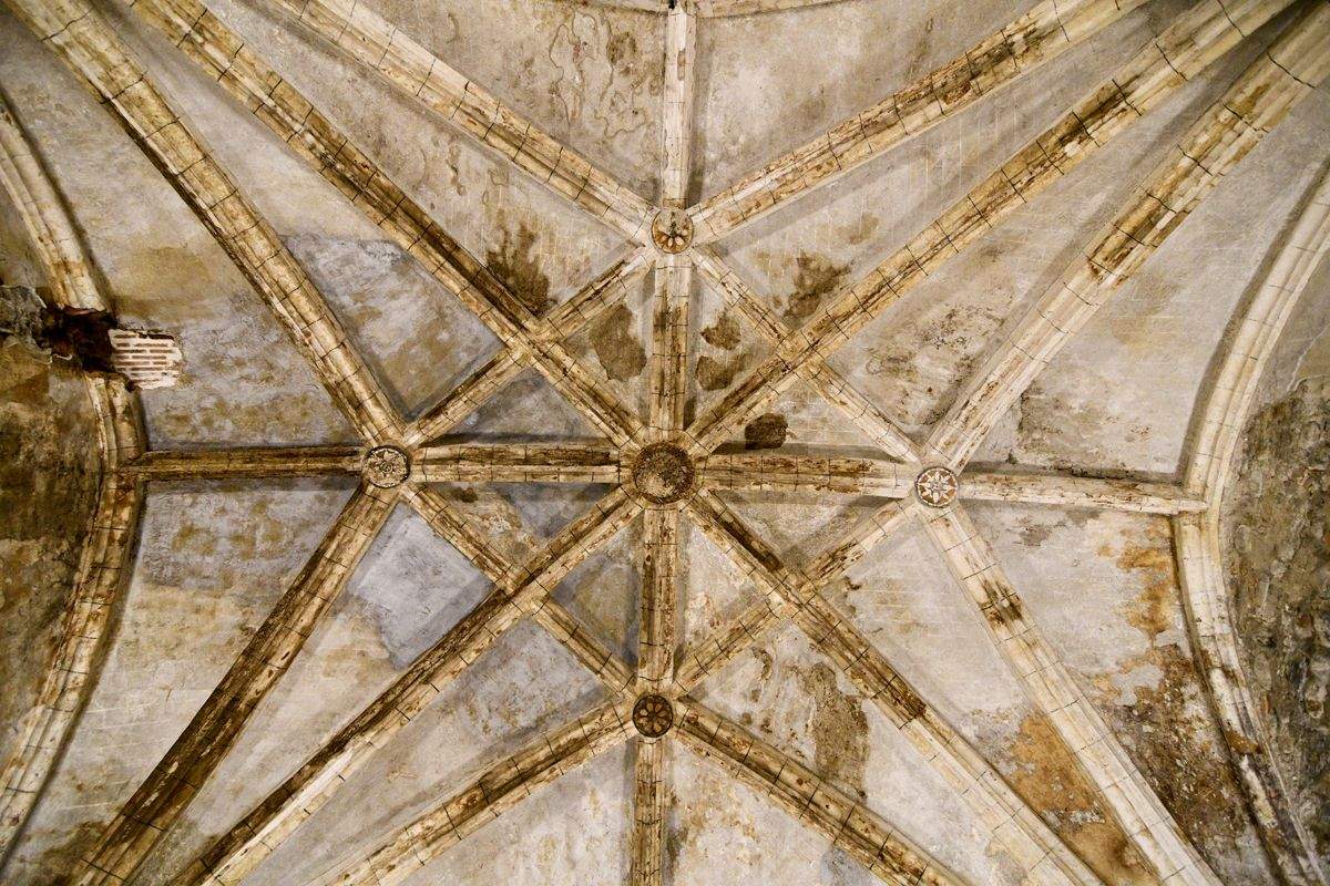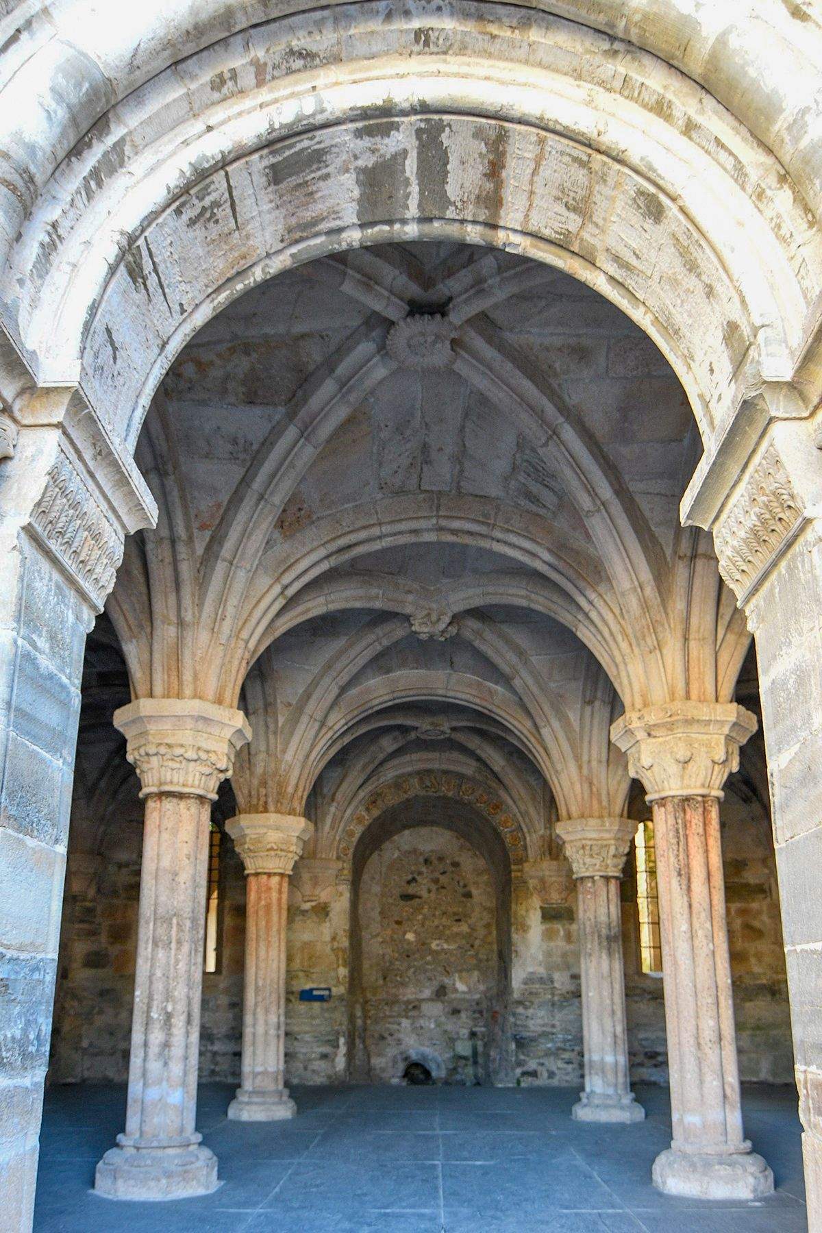"La bóveda de crucería en ladrillo corresponde a las reformas del siglo XVI que obligaron a rellenar el antiguo hueco del pólpito y de su escalera de acceso para apoyar alli el enjarje de las nervaduras. Las claves ofrecen motivos pintados, florales y un águila bicéfala coronada. Junto a la entrada desde el claustro, con arco de medio punto, en el que se aprovechan sillares medievales, se conserva un pequeño lavabo abierto en la pared. Tras la exclaustración, estuvo destinado a vivienda particular y cuadas, lo que exglica parte del ennegrecido por humo de las bóvedas. Sus puertas están hoy cogadas con ladrillo", explica la documentación de la sala.