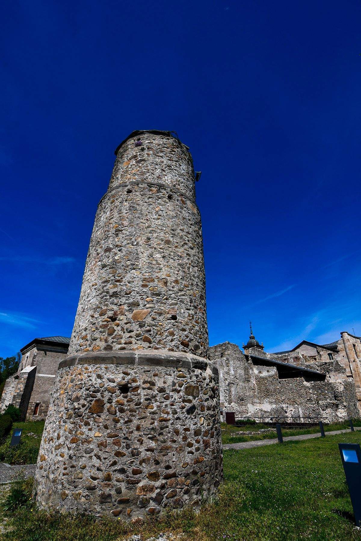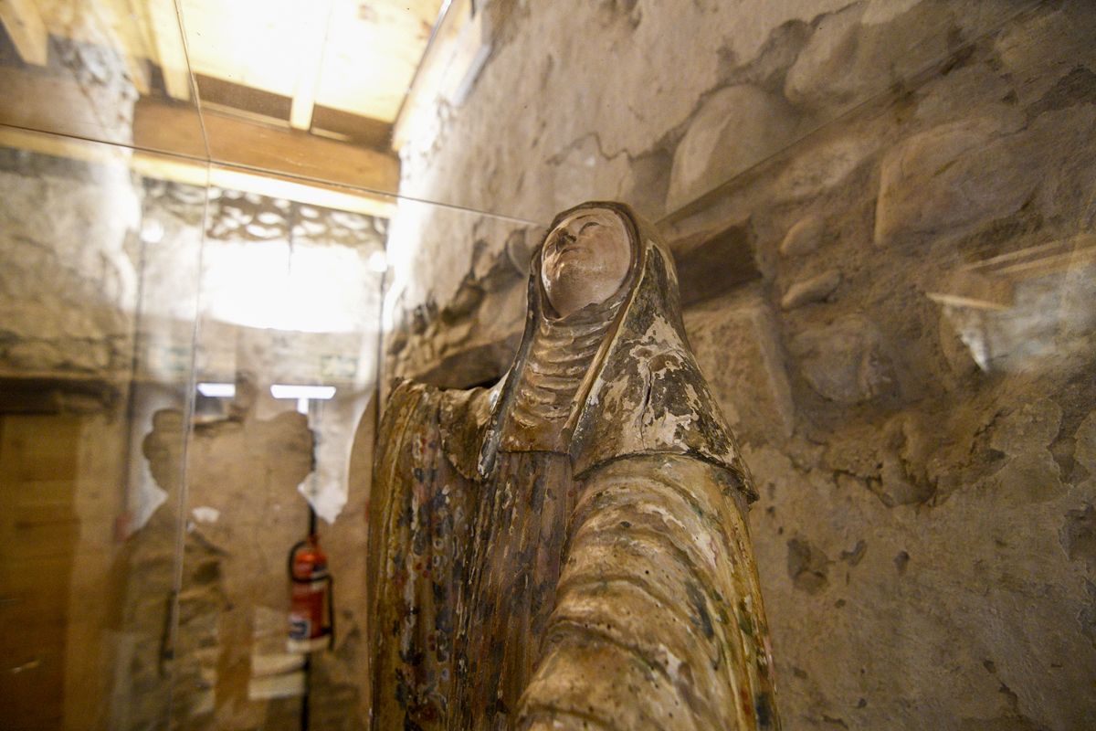 "Todo el cuerpo cilindrico por el que se asciende corresponde a la escalera de usillo medieval, con los peldaños construidos al tiempo que el muro. En el año 1690 se levanta la torre cuadrada, donde distia un reloj que miraba hacia el pueblo, y en su interior la campana de las horas y de los cuartos. En el año 1790 cayó un rayo sobre ella, destruyendol la aguja, y se construyó un chapitel nuevo revestido de pizarra dispuesta en escamas, sustituida por cobre en la restauración reciente", apunta la información del Monasterio.