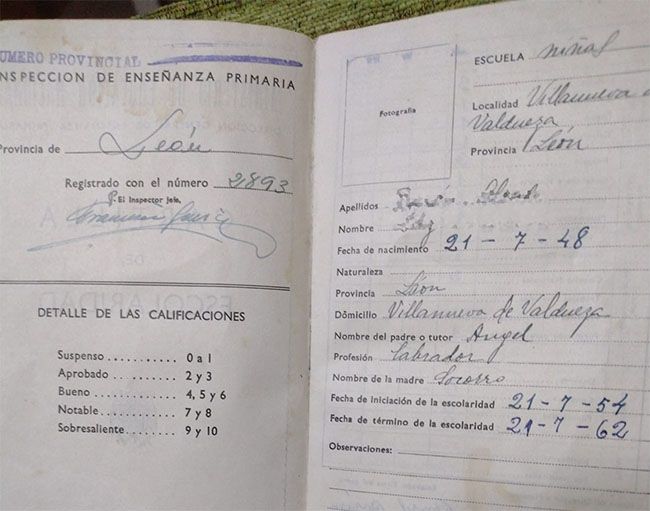 Sin embargo, los pueblos del Bierzo contaban con pequeñas escuelas rurales bajo las órdenes del Ministerio de Educación Nacional que llenaron los pupitres de aquellas escuelas de pueblo, divididas por sexos. Los niños por un lado y las niñas por el otro, nada de grupos mixtos como en la actualidad. Y es que, vale con observar una cartilla de registro educativo para poder ver de primera mano la fuerte ideología que de una u otro forma también se transmitía a los jóvenes estudiantes, desde el canto franquista del Cara Al Sol cada día en las aulas, como también pequeñas muestras que en la actualidad no pasan desapercibidas, como esta cartilla educativa de la escuela de niñas de la localidad ponferradina de Villanueva de Valdueza, fechada de los años 50 y 60 en España, plena Dictadura Franquista.