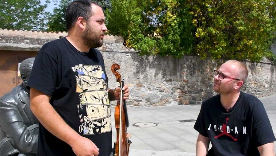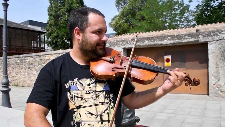 A media mañana, el violinista de Ponferrada, Edgar, esperaba con su instrumento en la Plaza del Violinista de Ponferrada, ubicada en las inmediaciones del Casco Antiguo de la ciudad. Con 14 años de estudios profesionales de música, 10 en Ponferrada y 4 en Oviedo, y después de haber pasado por varias academias como profesor, vive pegado a un violín mientras regala a las gentes sus melodías. "A veces la simple sonrisa de un niño cuando pasa por delante, es como un aplauso, eso es lo que llena". Una persona siempre preparada para la aventura, para la construcción conjunta y por supuesto, para regalar su música, esa que sale de un violín firmado por Joaquín Sabina, tras su actuación en los históricos Premios Micrófonos de Oro de Ponferrada.