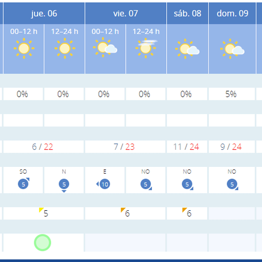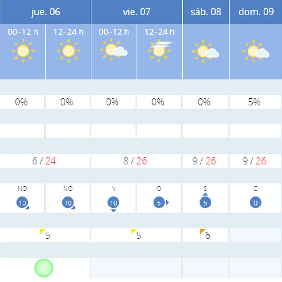 Los ‘días grandes’ de la Semana Santa –jueves, viernes, sábado y domingo- los cielos amanecerán despejados y se mantendrán de esta manera durante toda la jornada, con temperaturas primaverales cuyas mínimas rondarán los 9 grados y las máximas los 25 grados. Por este motivo, no peligrarán las procesiones por probabilidad de lluvia y los fieles podrán disfrutar de temperaturas primaverales en la procesión del encuentro (viernes 9 horas), la procesión del entierro y desenclavo (viernes 18:30 horas), la procesión de la soledad (sábado 22 horas), la procesión de la luz ( sábado 00 horas), y la procesión de la resurrección (domingo 11 horas) y podrán desarrollarse con normalidad.