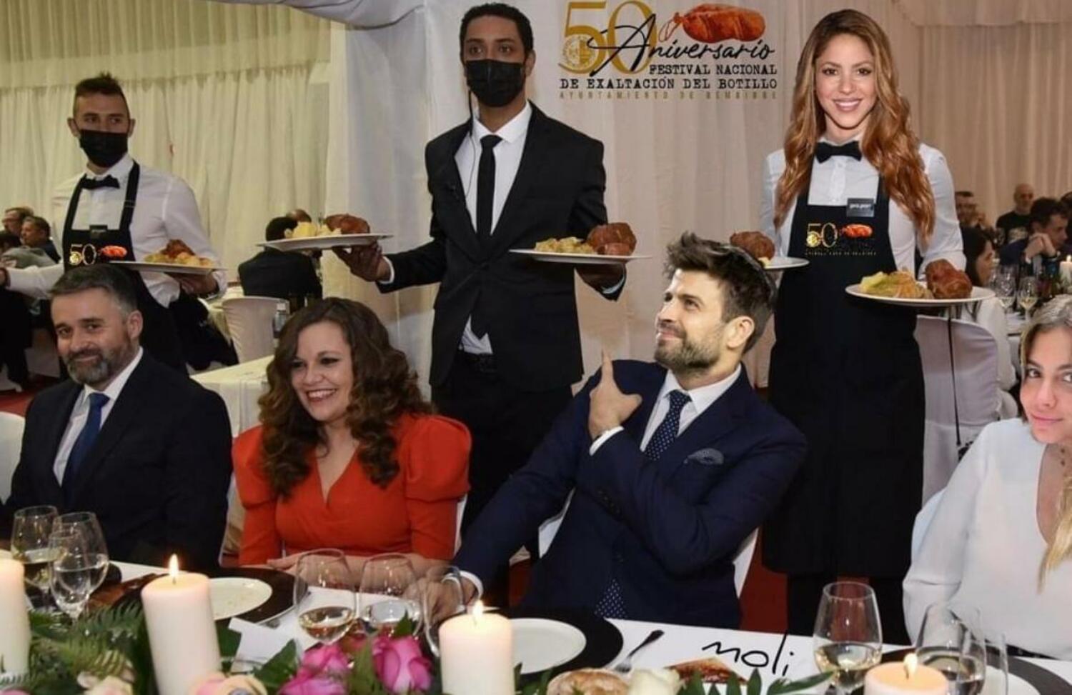 El exjugador del Barça aparece sentado junto a la alcaldesa Silvia Cao, y junto a él, su novia Clara. Detrás, de camarera está la cantante, clara-mente no le hace mucha gracia.