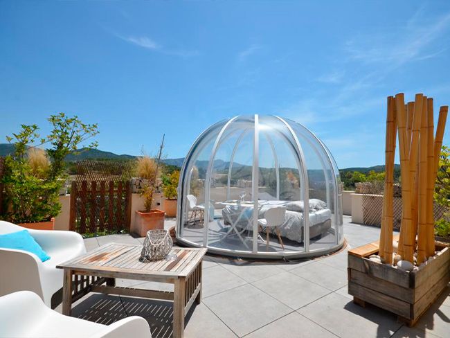 La finca, de hecho, cuenta con placas solares, suelo radiante en invierno y frío en verano y una piscina es natural (que no utilizan cloro, sino agua ionizada). Su pequeño spa privado para parejas y los masajes al aire libre completan la experiencia, e incluso tienen una suite burbuja para dormir bajo las estrellas. Por supuesto, los perros pueden estar con los dueños en todos los espacios (también en la piscina).