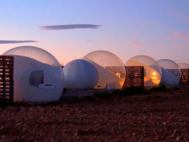 Aire de Bardenas es un insólito alojamiento instalado en un campo de trigo, junto a la entrada del Parque Natural de las Bardenas Reales. Su construcción principal, en forma de cubos dispersos por el espacio, ha sido galardonada con más de una veintena de premios de arquitectura e interiorismo, pero además, cuenta con habitaciones-burbuja, aunque en ellas no pueden alojarse perros. En el resto de este entorno casi marciano sí que están permitidos.