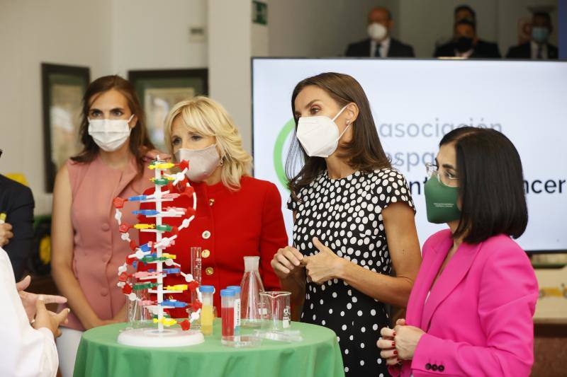 (La reina Letizia con la primera dama Jill Biden durante los días de la reunión de la OTAN)"Su Majestad la Reina tiene COVID, con síntomas leves. Se suspenden las audiencias previstas para mañana y en función de cómo se encuentre el jueves, acudirá o no a los premios Mariano de Cavia", afirmaró en un comunicado la Casa Real.