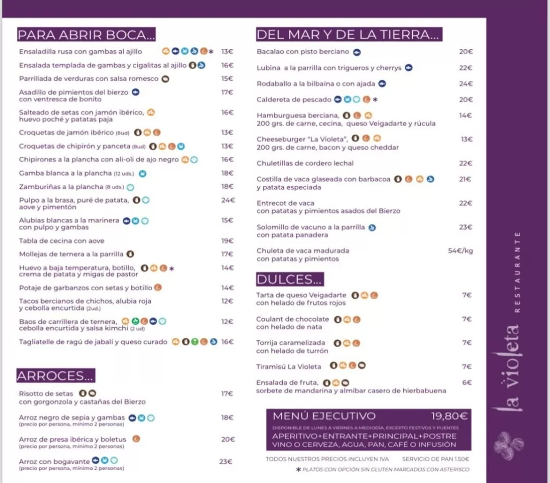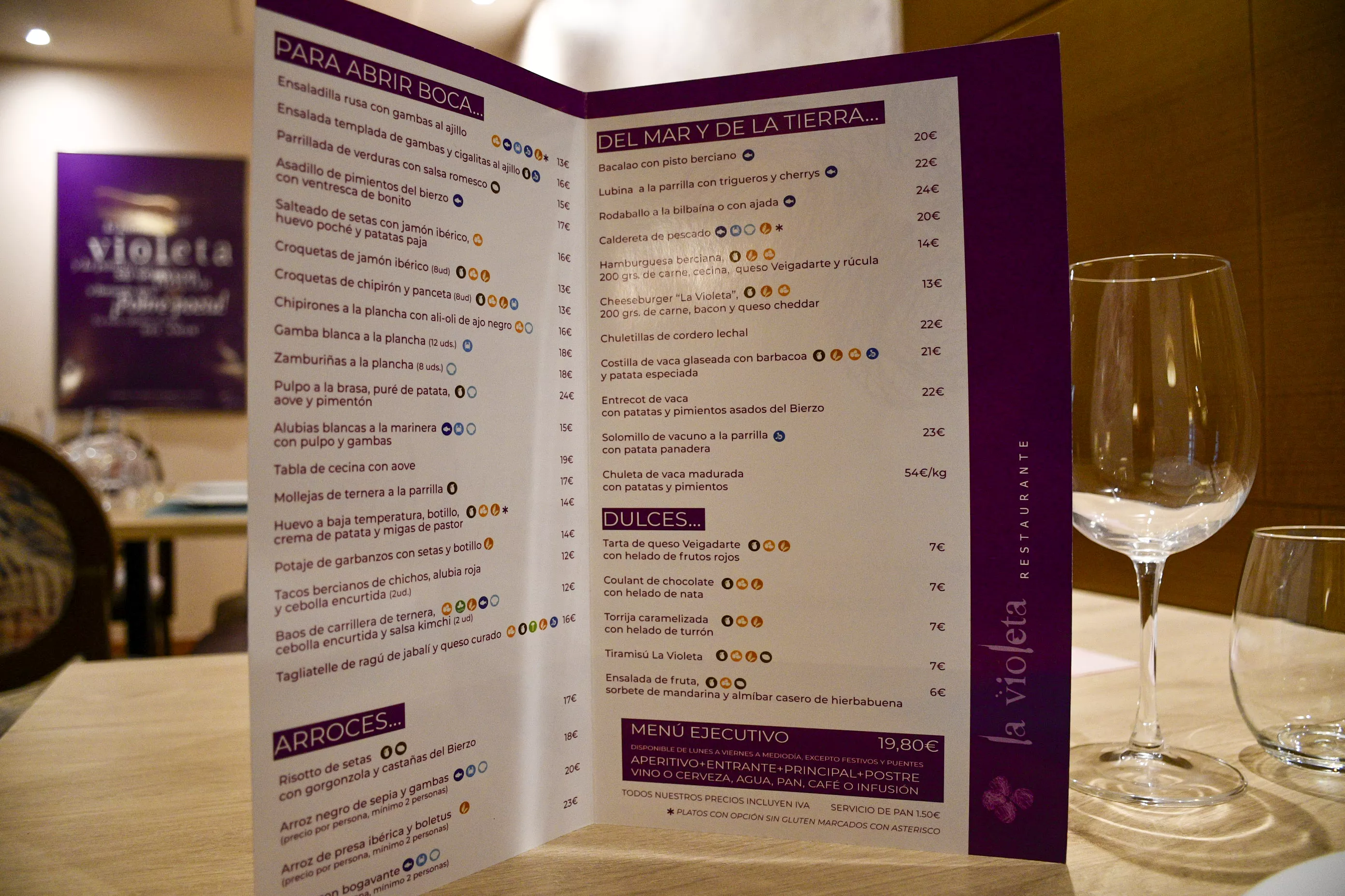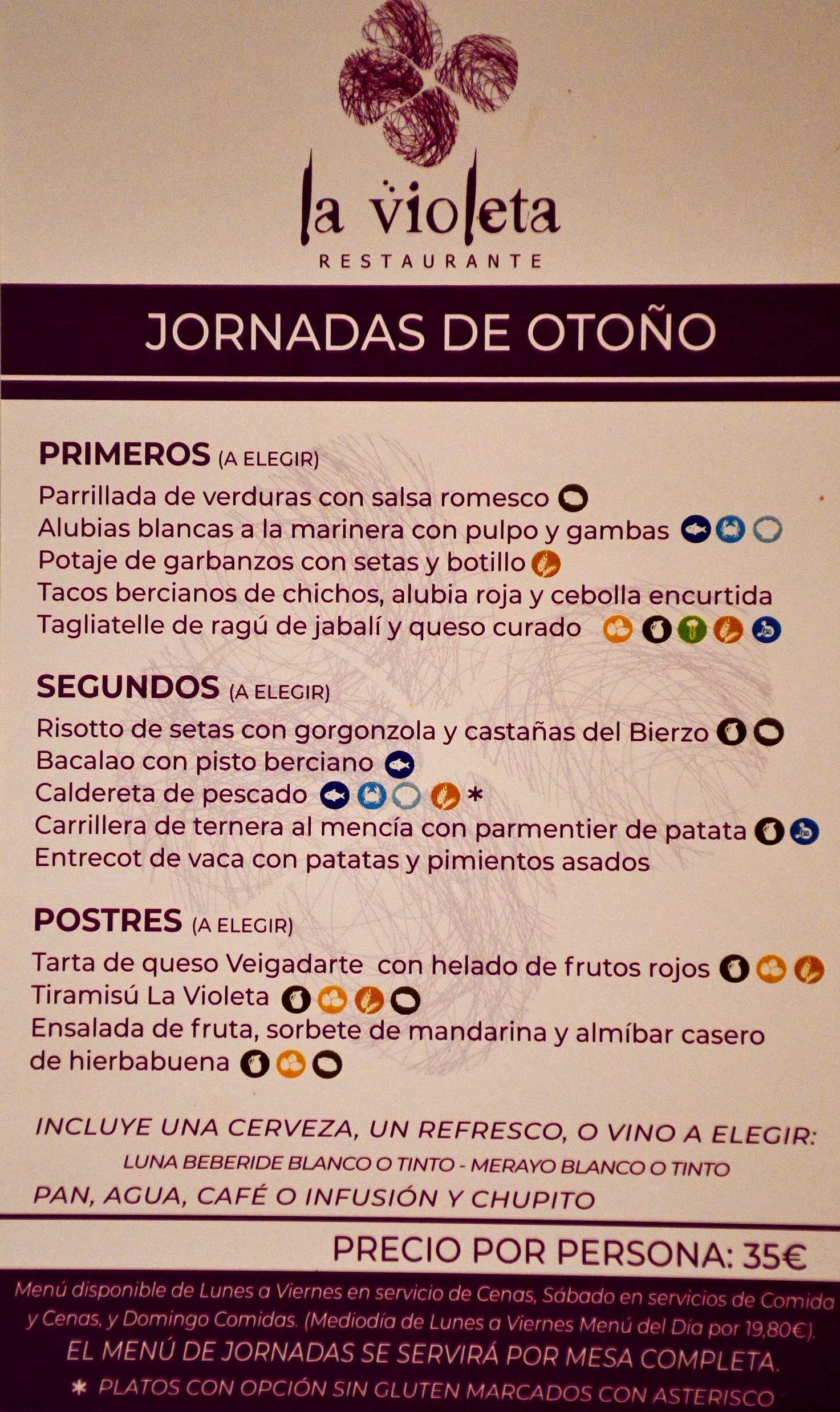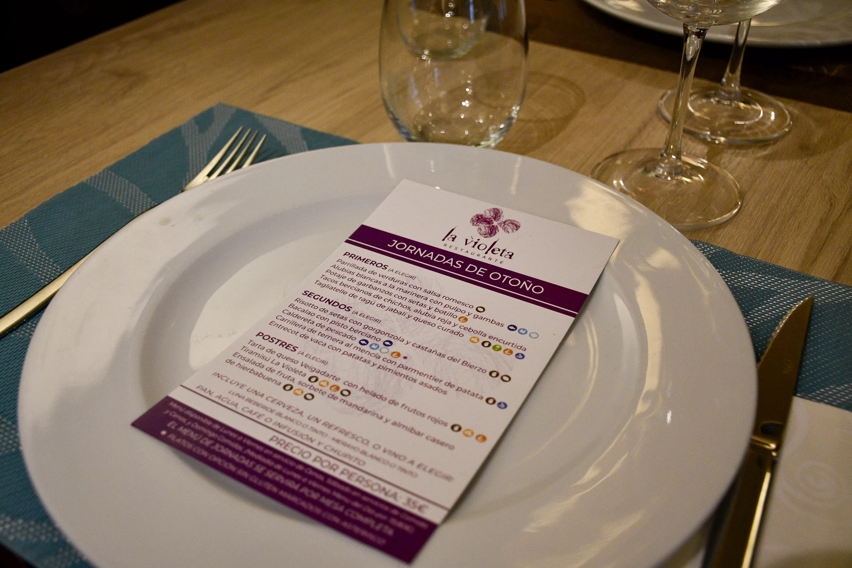 Es por ello que La Violeta da la bienvenida a su Menú de Jornadas de Otoño que estará disponible hasta Navidad. Este menú consta de 5 opciones a elegir de primeros platos, otros 5 de segundo y 3 de postre, además de agua, refresco o cerveza y vino de DO Bierzo, con un precio de 35 euros por persona. El Menú de Jornadas de Otoño se oferta de lunes a viernes en horario de cenas, los sábados en horario de comida y cena y el domingo solamente para comer, ya que el restaurante no cuenta con servicios de cenas este día. Al margen de este menú, La Violeta tiene disponible su carta para todos los servicios y el Menú Ejecutivo que se encuentra disponible durante todo el año de lunes a viernes en horario de comidas por 19,80 euros.