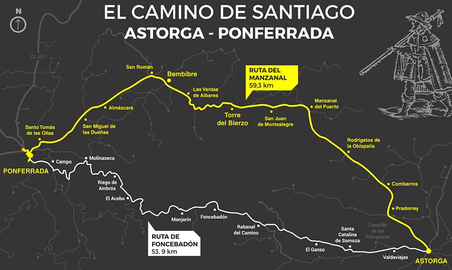 Desde este punto, continúa el camino hacia Bembibre, donde el caminante pasará por delante de su ermita de El Santo, las callejuelas de la ‘Villavieja’, bajando por la ‘Rúa de los peregrinos’ hacía la plaza Mayor, donde en tiempos se levantaba una sinagoga judía antes de ser la actual iglesia de San Pedro. El recorrido sigue hacia San Román de Bembibre, San Miguel de las Dueñas y Ponferrada, donde enlaza con el Camino Francés.