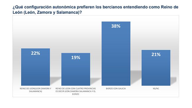 El último apartado de la encuesta, en el que los bercianos podían elegir una hipotética nueva configuración autonómica, la mayoría (38%) preferiría anexionar El Bierzo a Galicia. Un 22% escogió la opción del Reino de León formado por León, Zamora y Salamanca, seguido del 21% que no sabe o no contesta. El resto, un 19% de los encuestados, optarían por un Reino de León con 4 provincias (León, Samora, Salamanca y El Bierzo).
