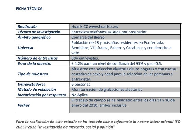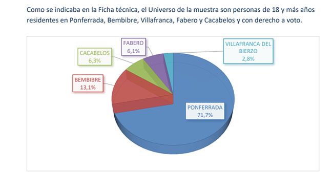Así lo ha revelado una encuesta realizada por la compañía Huaris CC, de reputado prestigio profesional en el ámbito demoscópico, para InfoBierzo. La muestra elegida para dicha encuesta realizada por teléfono ha sido de 604 entrevistas a población de más de 18 años, con derecho a voto y residentes en Ponferrada, Bembibre, Villafranca, Fabero y Cacabelos.