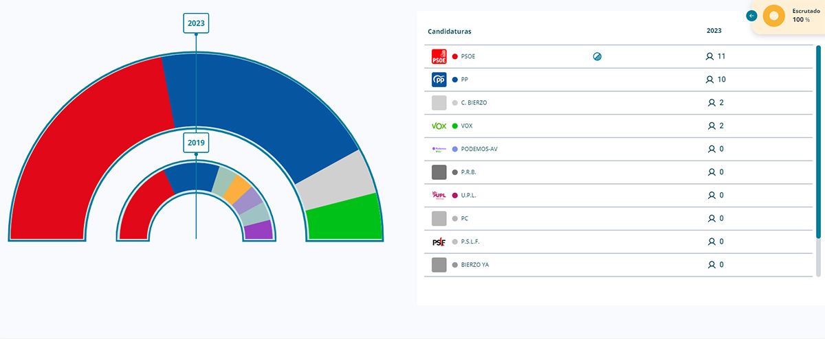 Olegario Ramón (PSOE) remonta a 11 concejales -de los 9 que logró en 2019- pero Marco Morala (PP) suma 10 -partía de 6 ediles-. Pierde un edil Coalición por El Bierzo al final del escrutinio (llegó a sumar 4), aunque los de Iván Alonso seguirían siendo llave. Podrían sumar mayoría absoluta con Olegario Ramón aunque en los últimos meses de alianza (gobiernan actualmente con el PSOE) han surgido discrepancias, principalmente por la aplicación de la Zona de Bajas Emisiones. Pueden dejar gobernar en solitario a uno de los bloques, y en ese caso la derecha (10 de PP y 2 de VOX) tendría más opciones de ascender a Marco Morala a la alcaldía porque la izquierda se queda sólo con el PSOE, que sumaría 11, tras la desaparición de Podemos, que pierde sus 2 escaños actuales. Lo tuvo por momentos el PRB pero ha terminado por quedar fuera de la Corporación.