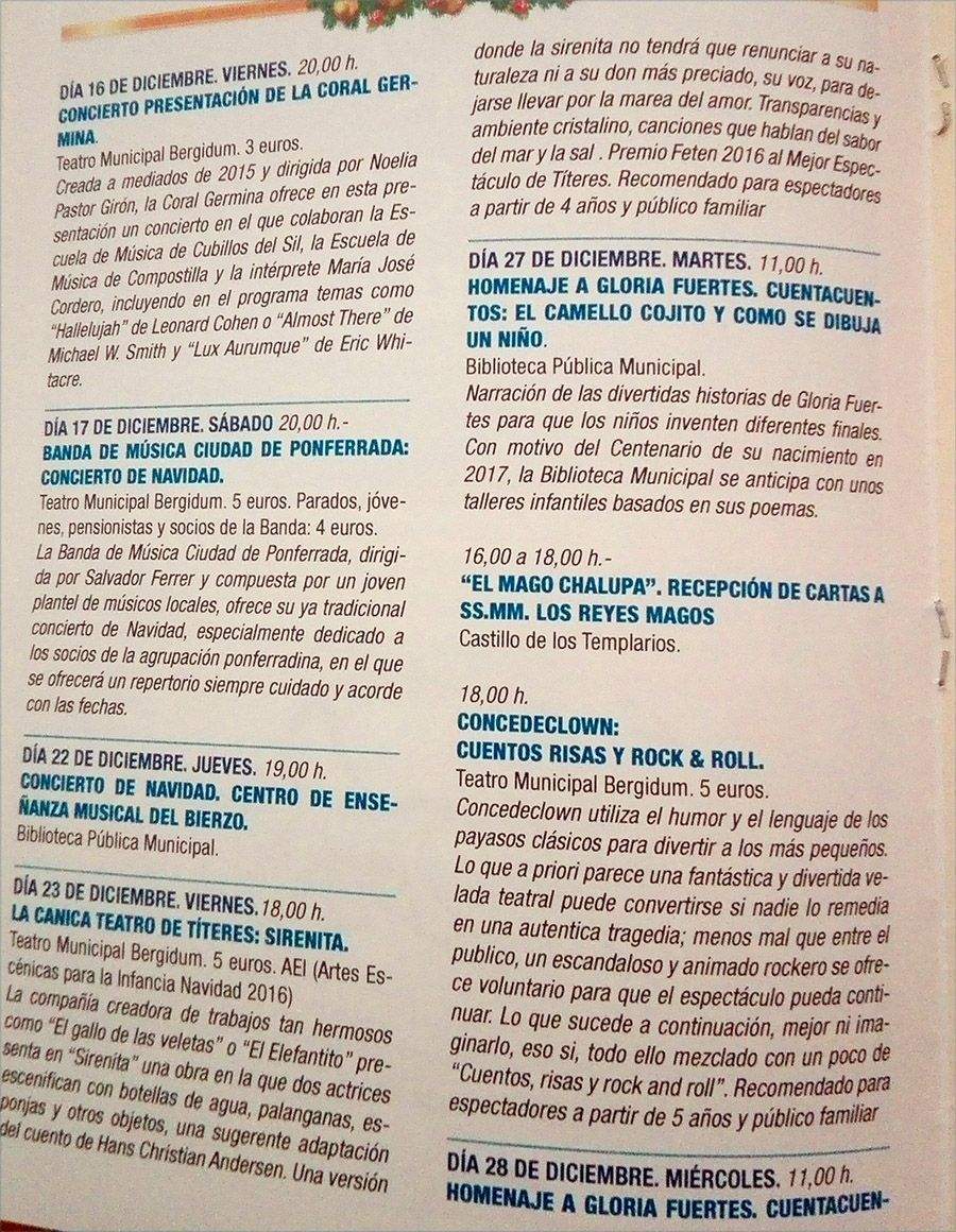 Sus Magestades los Reyes Magos visitarán los hospitales y residencias el jueves 5 de enero desde las 09.00 horas y a las 18.00 recorrerán las calles de la capital berciana con motivo de la tradicional Cabalgata, que partida de la Avenida de Portugal para acabar en la Plaza del Ayuntamiento, donde habrá un espectáculo de animación con sorteo incluido. La Gala de Reyes de Flores del Sil será al día siguiente a partir de las 17.00 horas en el Pabellón.