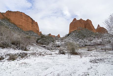 La bajada de las temperaturas y la llegada de la nieve para recibir a la primavera se extenderá durante toda la semana en El Bierzo. El miércoles la nieve cayó sobre varios puntos de la Comarca dejando estampas como la de Las Médulas nevadas, uno de los puntos turísticos declarado Patrimonio de la Humanidad por la UNESCO, que ha cubierto con un manto blanco su característico tono rojizo.