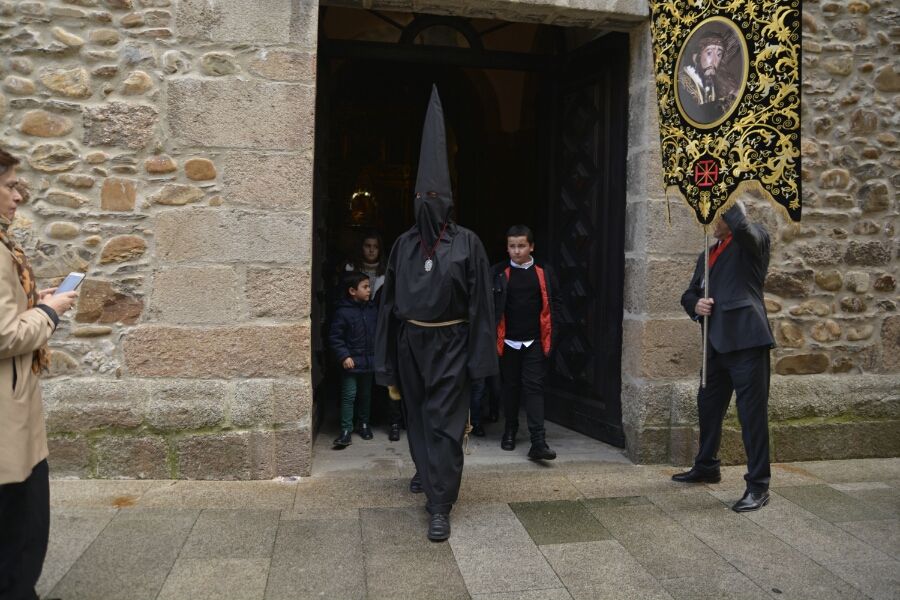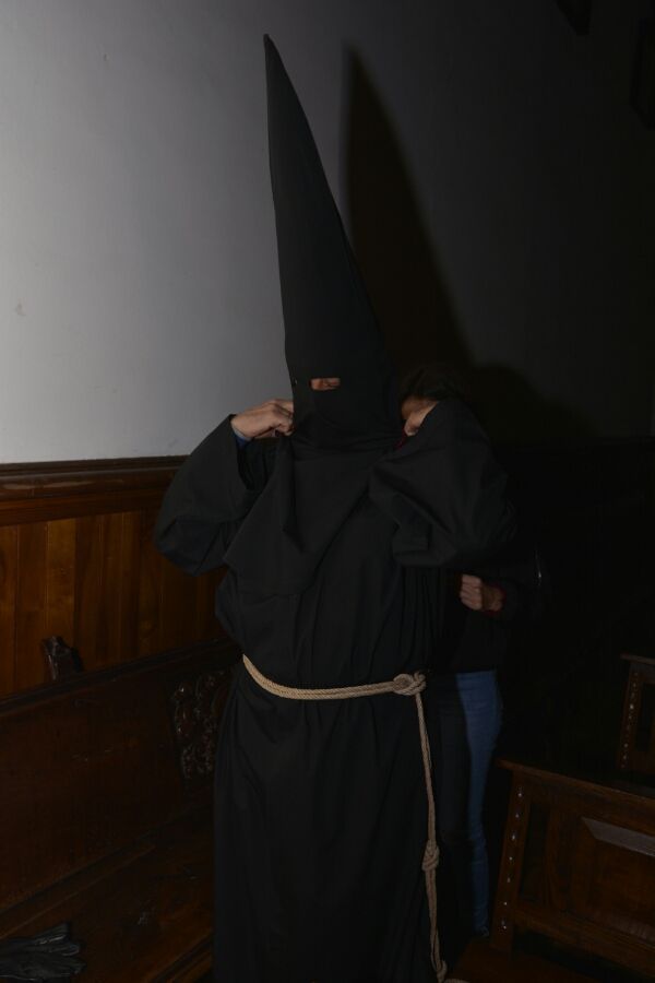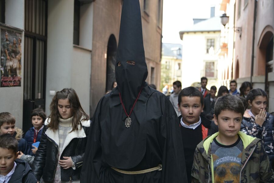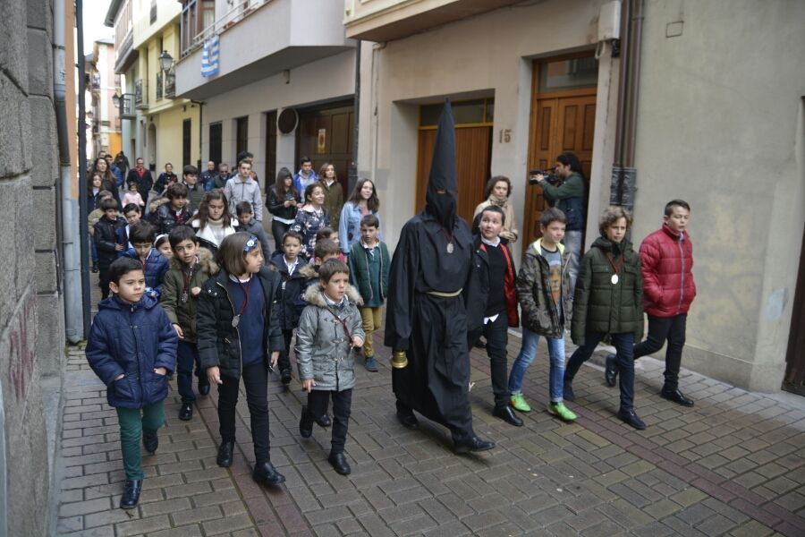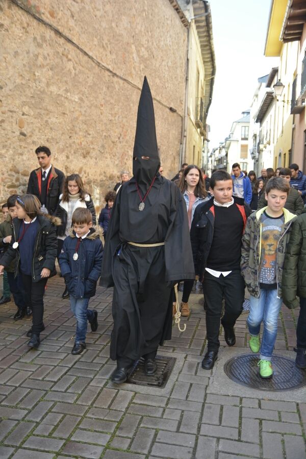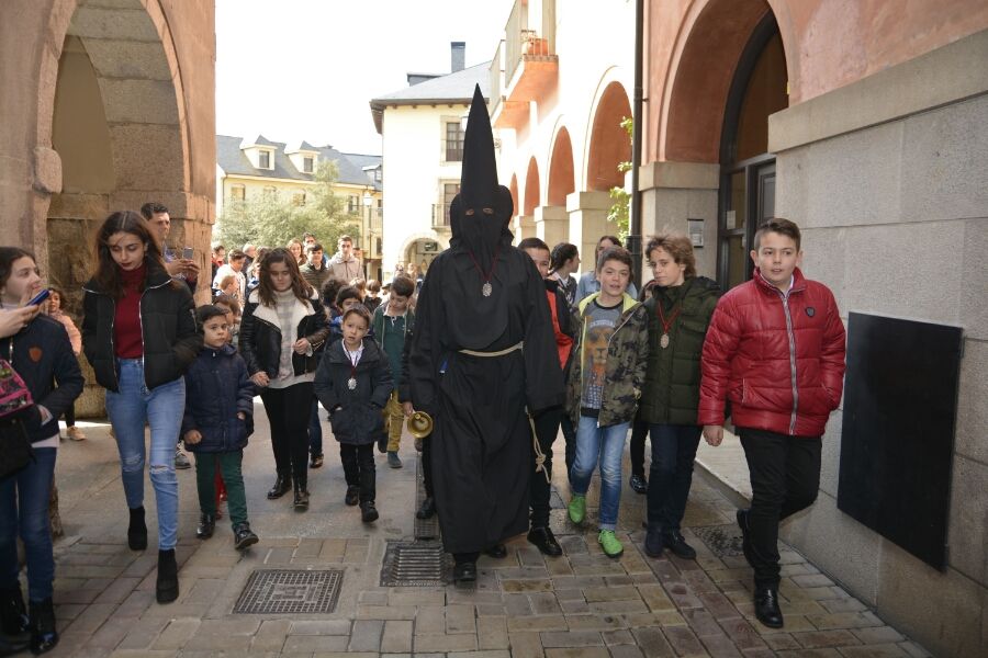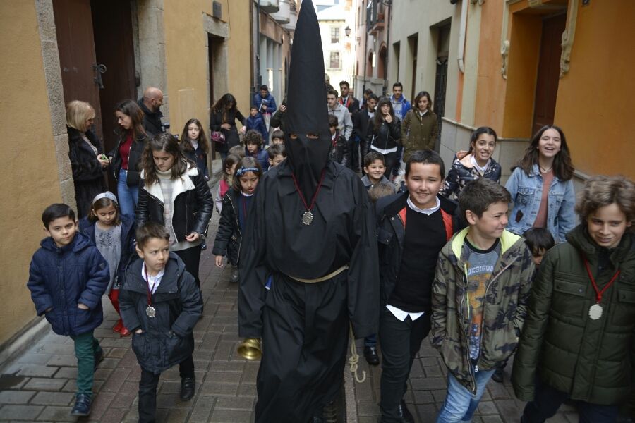 Vestido completamente de negro, con el rostro cubierto por el capirote, una soga de esparto a la cintura y una campana en la mano, el Lambrión Chupacandiles ha salido el sábado previo al Viernes de Dolores de la Basílica de La Encina para recorrer las calles ponferradinas rodeado de niños.