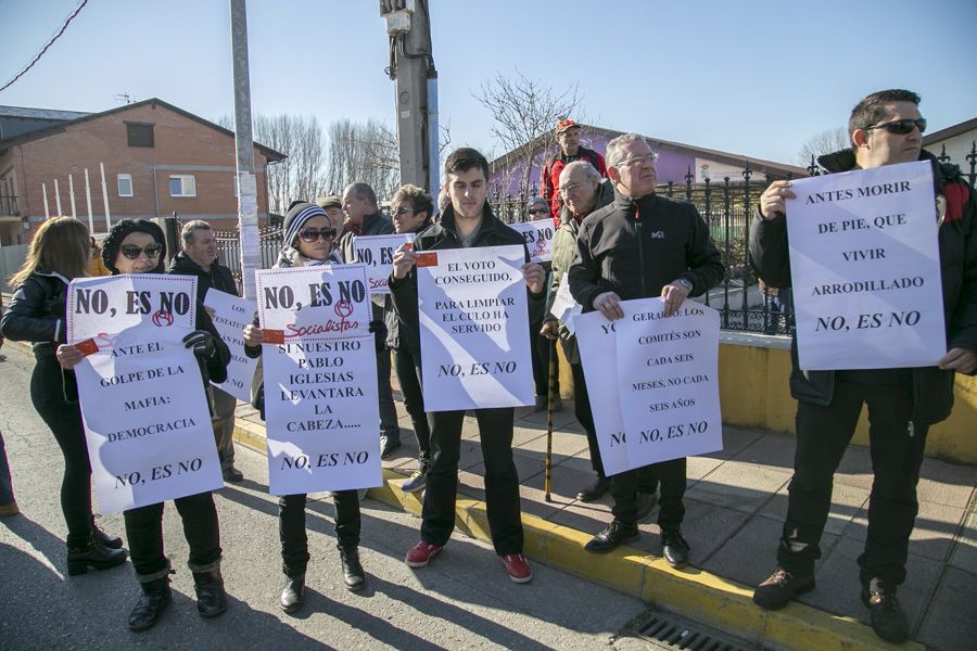 El comienzo del acto ha sido accidentado, cuando a un grupo de militantes (que portaban pancartas con lemas como 'Ante el golpe de la mafia: democracia' o 'Si nuestro Pablo Iglesias levantara la cabeza', y con gritos de 'no es no' y 'fuera caciques del PSOE') se les ha impedido la entrada al recinto, por lo que los gritos y quejas han aumentado e incluso alguno de ellos ha saltado la verja, que se había cerrado previamente para que no pudieran entrar.