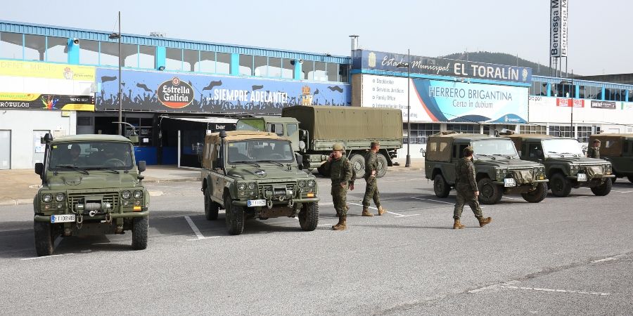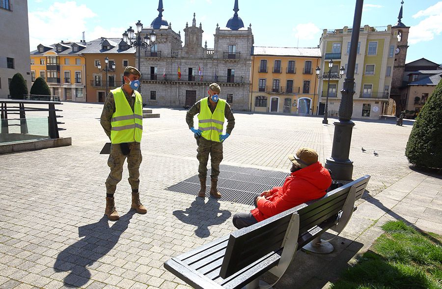 El 19 de marzo, efectivos militares del Regimiento de Artillería Lanzacohetes de Campaña (RALCA) del Ejército de Tierra, con sede en Astorga, llegaron a Ponferrada para patrullar las calles. El objetivo principal era garantizar que los ciudadanos ponferradinos cumplieran el Real Decreto del estado de alarma. La imagen de militares controlando las calles de la capital berciana impactaba por evocar un escenario casi de guerra. (Foto César Sánchez / ICAL)