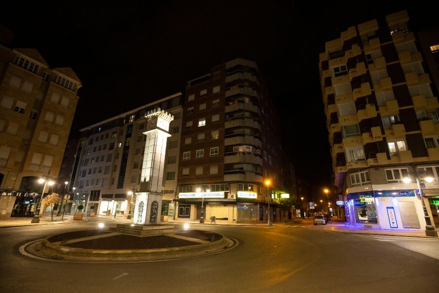Después de que la Junta confinase perimetralmente Ponferrada con carácter inmediato el 23 de octubre, al día siguiente se aprobó la orden de ‘desconfinar’ la capital berciana desde el día 24 a raíz de la instauración del toque de queda general en Castilla y León, que prohibía la movilidad entre las 22:00 y las 06:00 horas salvo causas justificadas. La primera noche dejaba en Ponferrada impactantes imágenes que parecían el escenario de una película de ciencia ficción, recordando el confinamiento de marzo, en la primera hola. (Foto: César Sánchez / ICAL)
