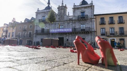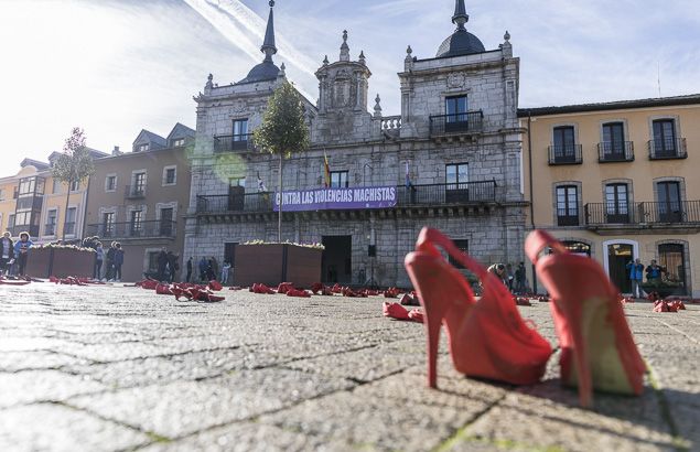166 pares de zapatos rojos ocupan la Plaza del Ayuntamiento de Ponferrada para visualizar la violencia machista