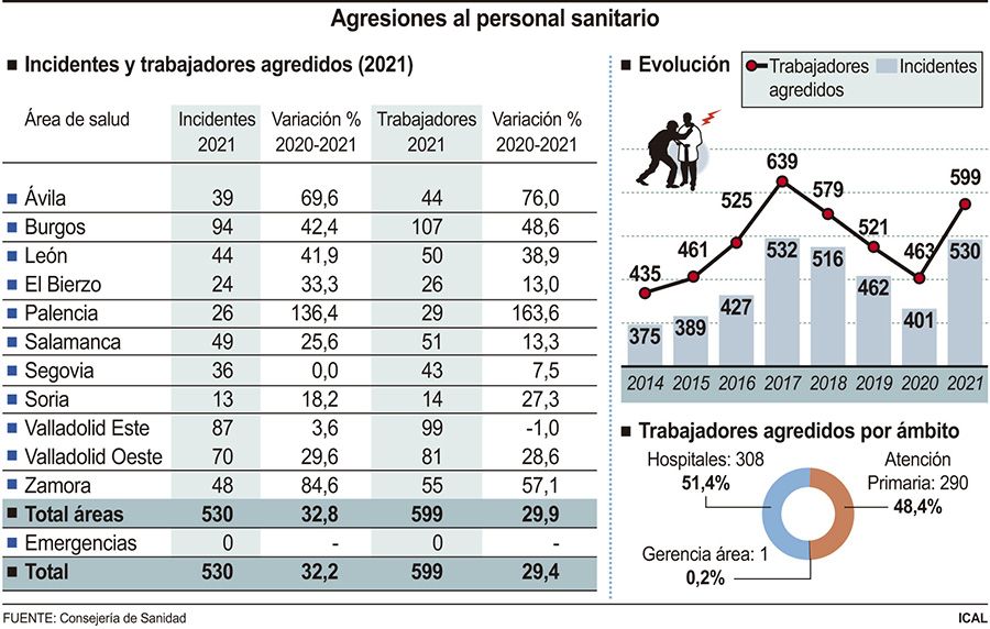 Por áreas de salud, en cabeza se situó Burgos con 107 agresiones, por delante de ‘Valladolid Este’ (99), ‘Valladolid Oeste’ (81), Zamora (55), Salamanca (51) y León (50). En el otro extremo se sitúa El Bierzo (26), Palencia (29), Segovia (43) y Ávila (44).
